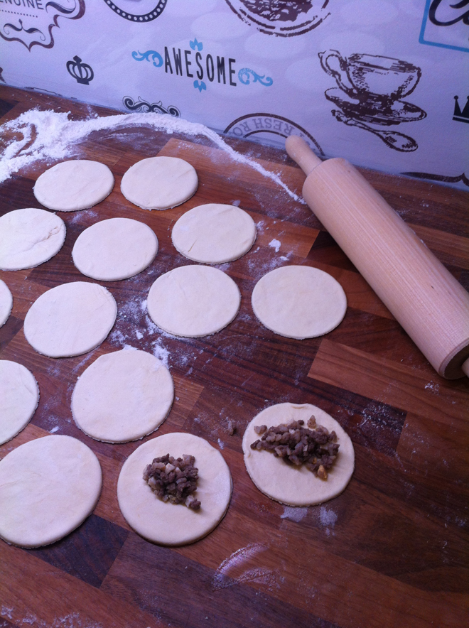 Taikina kaulitaan ohueksi levyksi ja siitä painellaan muotilla pyöreitä paloja. Meillä muottina toimii Iittalan Kartio lasi. Täyteessä on jauhelihaa, riisiä, kananmunaa ja mausteita