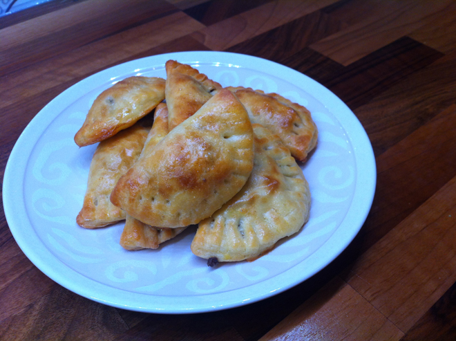 (400g jauhelihaa, n. 4 rkl kypsää puuroriisiä, 2 kypsäksi keitettyä kananmunaa, lihaliemikuutio raastettuna, suolaa, maustepippuria sekä Santa Marian Garlic & Pepper mausteseosta myllystä). Piirakat painellaan haarukalla kiinni, voidellaan kananmunalla ja paistetaan 200 asteessa noin 15 minuuttia.
