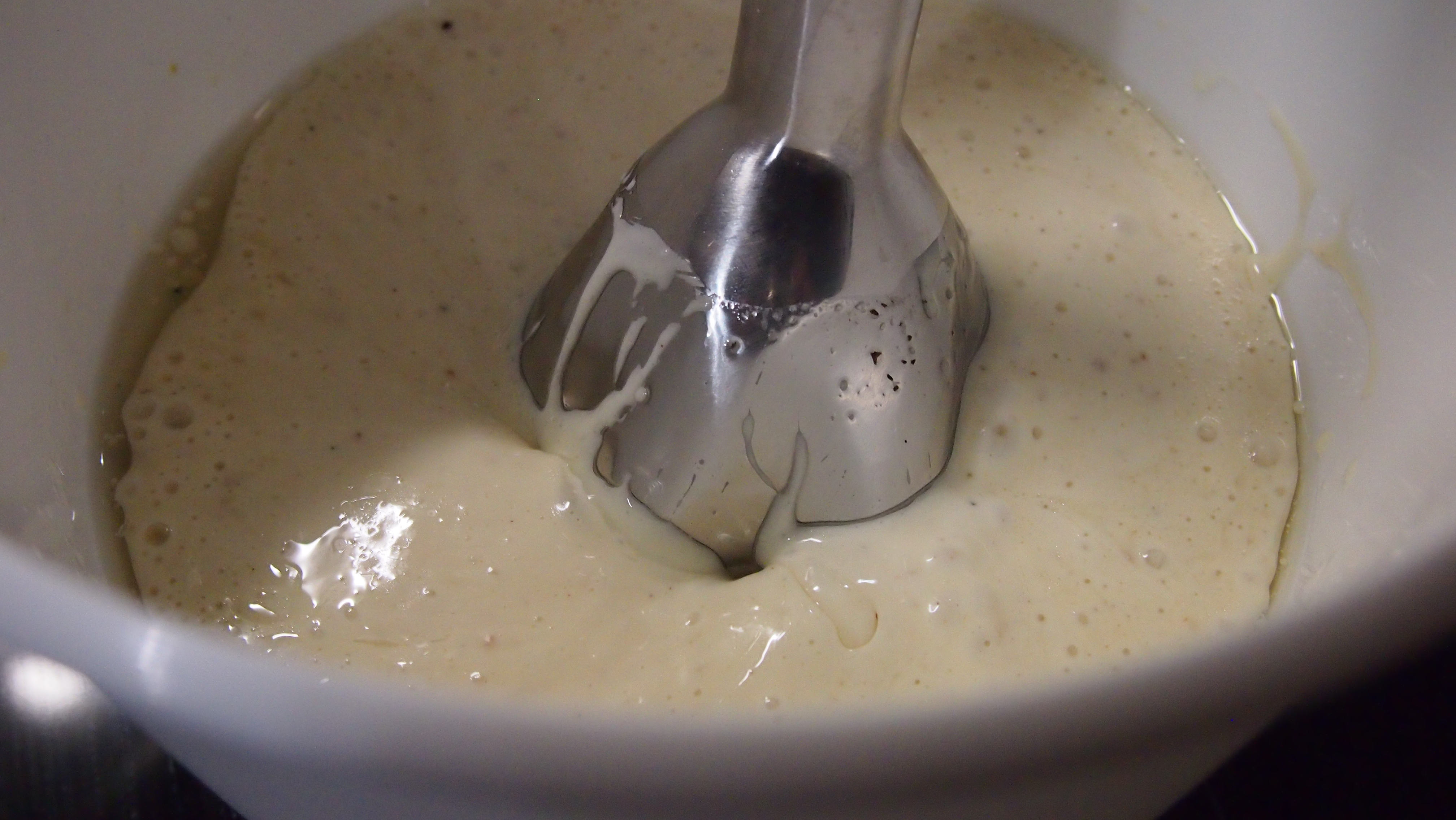 Parastahan tässä on se, että kaikki aineet laitetaan astiaan ja ne vedetään kerralla sauvasekoittimella sekaisin kunnes koostumus on kermaista ja kastike saa vaalean värin. Tästä ei voi paljon helpommaksi kastikkeenteko muuttua! Anna kastikkeen tekeytyä jääkaapissa mielellään pari tuntia, mutta sitä voi toki käyttää hetikin. Ja vaikka kuinka inhoaisit anjovista, ÄLÄ jätä sitä pois. Se on juuri se aines, joka tekee Caesar kastikkeesta Caesar kastikkeen.