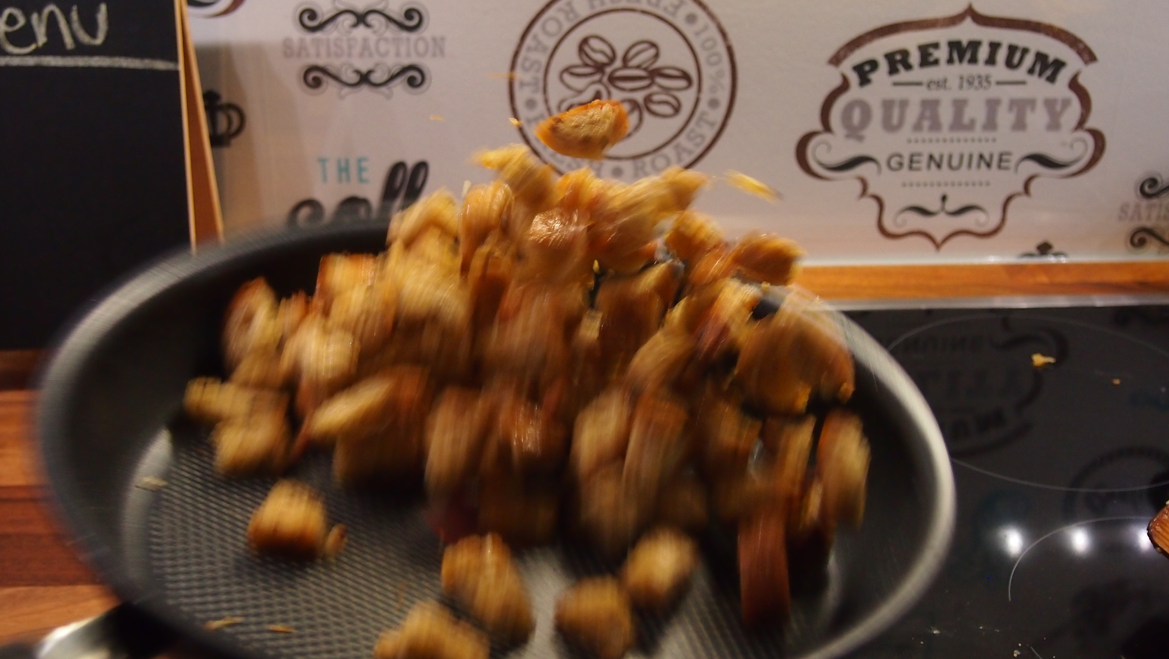 Seuraavaksi valmistetaan krutongit. Tähän käy mikä tahansa vaalea leipä, tai miksei ruisleipäkin. Me suosimme yleensä jyväistä leipää. Leivästä leikataan kuutiota ja ne paistetaan oliiviöljyssä pannulla miedolla lämmöllä. Meidän pannulla luonnollisestikin tirisee myös valkosipuli.