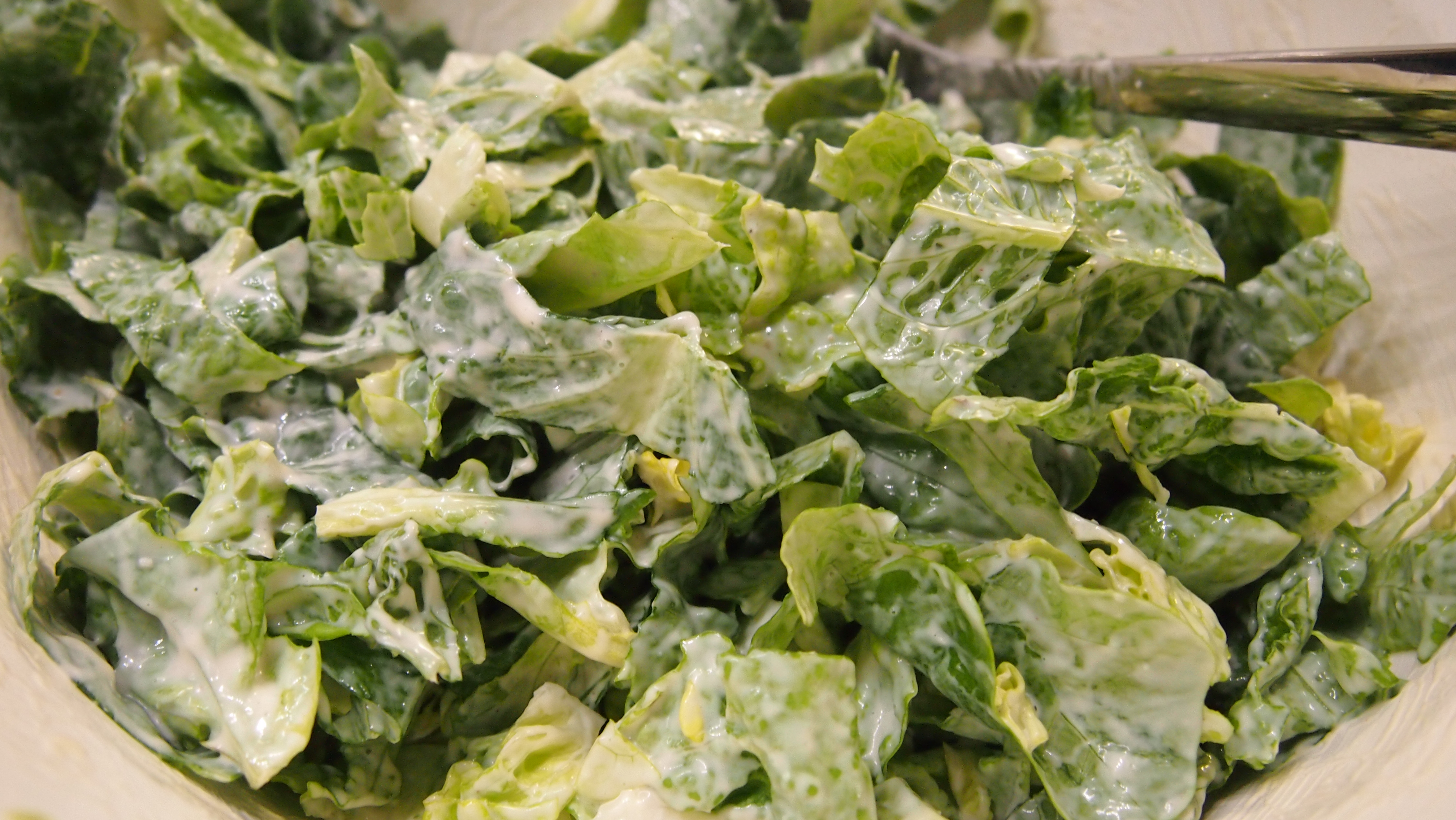 Sitten vaan salaatit revittyinä isoon kulhoon: romainea ja murcianoa. Salaatinkastike sekoitetaan salaatin joukkoon kulhossa, että se saadaan kunnolla tarttumaan salaatin pintaan. Kippaa salaatit lautasille, asettele lämmin kana salaatin päälle. Viimeistele annos krutongeilla ja parmesanjuustolla. Taivaallisen hyvää!