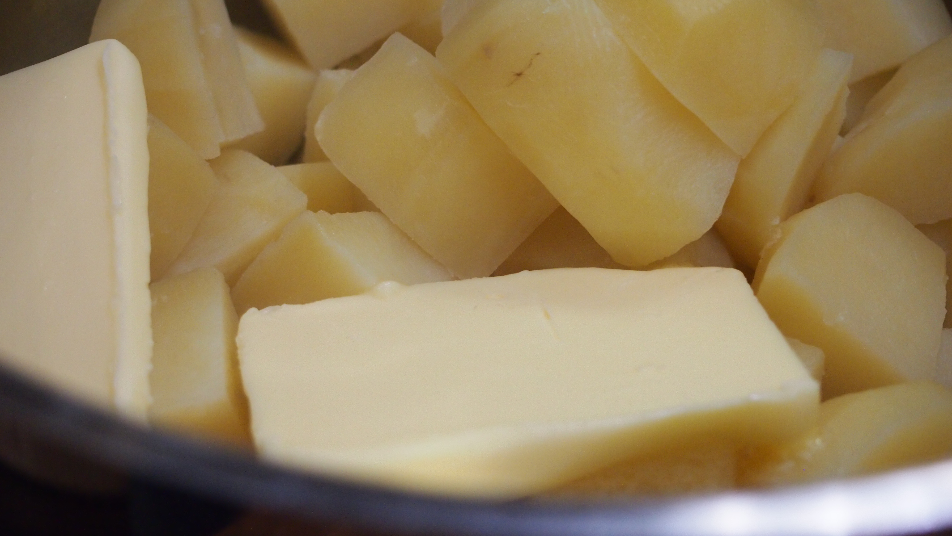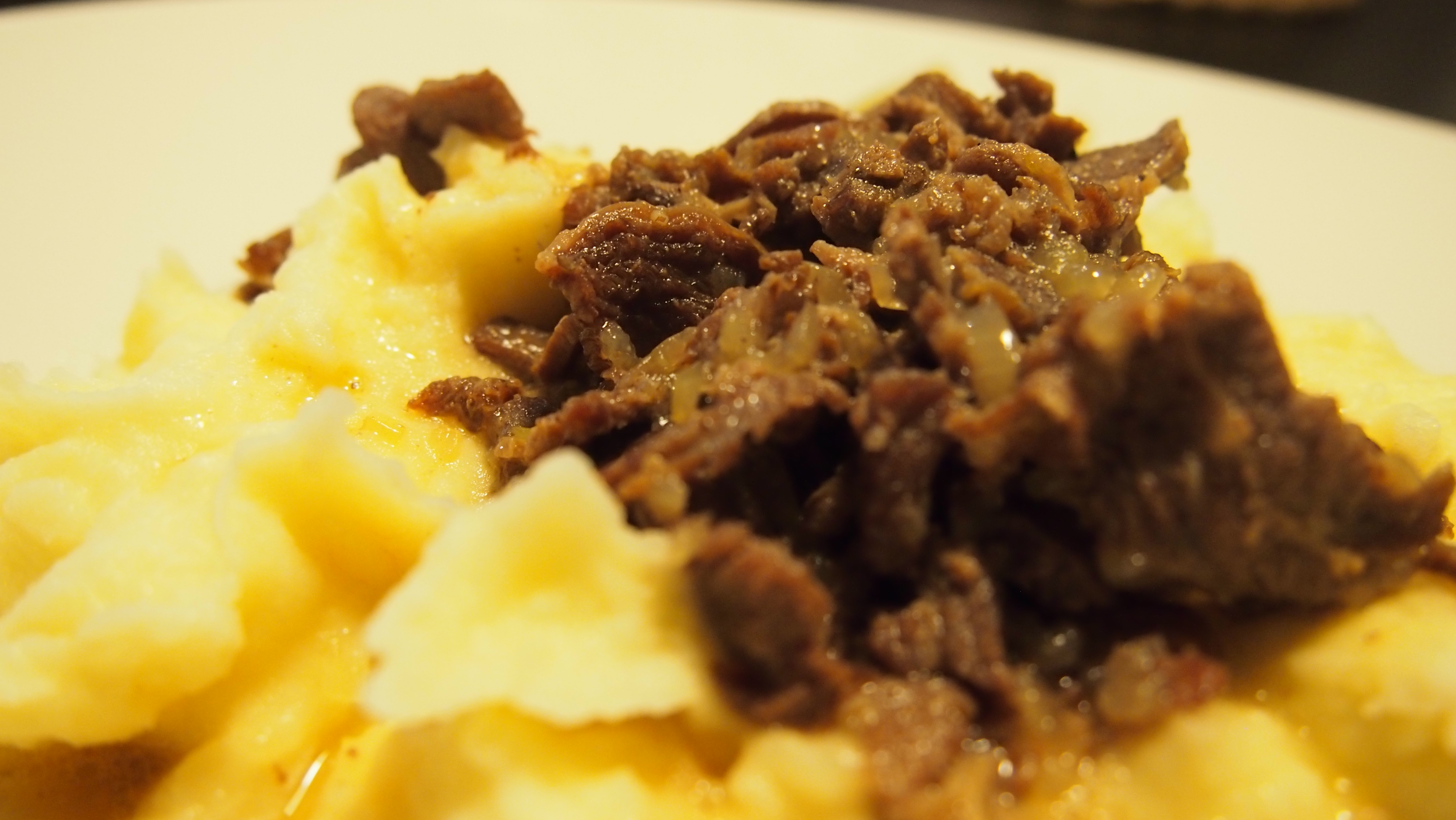 Anna käristyslihan sulaa jääkaapissa tunti pari, niin että liha on vielä kohmeista. Ruskista liha muutamassa erässä voissa. Meillä oli 750g pussi käristyslihaa. Nosta ruskistettu liha pataan. Hienonna 2 sipulia, kuullota ne voissa ja lisää pataan. Kaada pataan 2 dl vettä ja 2 dl tummaa olutta. Mausta 2 tl suolalla, 1/2 tl mustapippurilla ja laakerinlehdellä. Kansi päälle ja käristys 200 asteiseen uuniin muhimaan tunniksi tai vaikka vähän reiluksi tunniksi. Lihan kypsyessä on aikaa valmistaa pottuvoi. Pottuvoihin olen enimmäisen kerran törmännyt nimenomaan Lapissa, Kammin Poropeijaisissa. Siellä kerrottiin että illan pottuvoissa on 5 kg perunaa ja 3 kg voita ja sen kyllä maistoi. Parasta ”perunamuusia” mitä olen ikinä syönyt! Meillä suhde ei ehkä ollut ihan noin ”voinen”, mutta kyllä tästäkin aika voinmakuinen muusi tuli 🙂 Lautanen tuli syötyä tyhjäksi viimeistä käristyslihanpalaa myöden.
