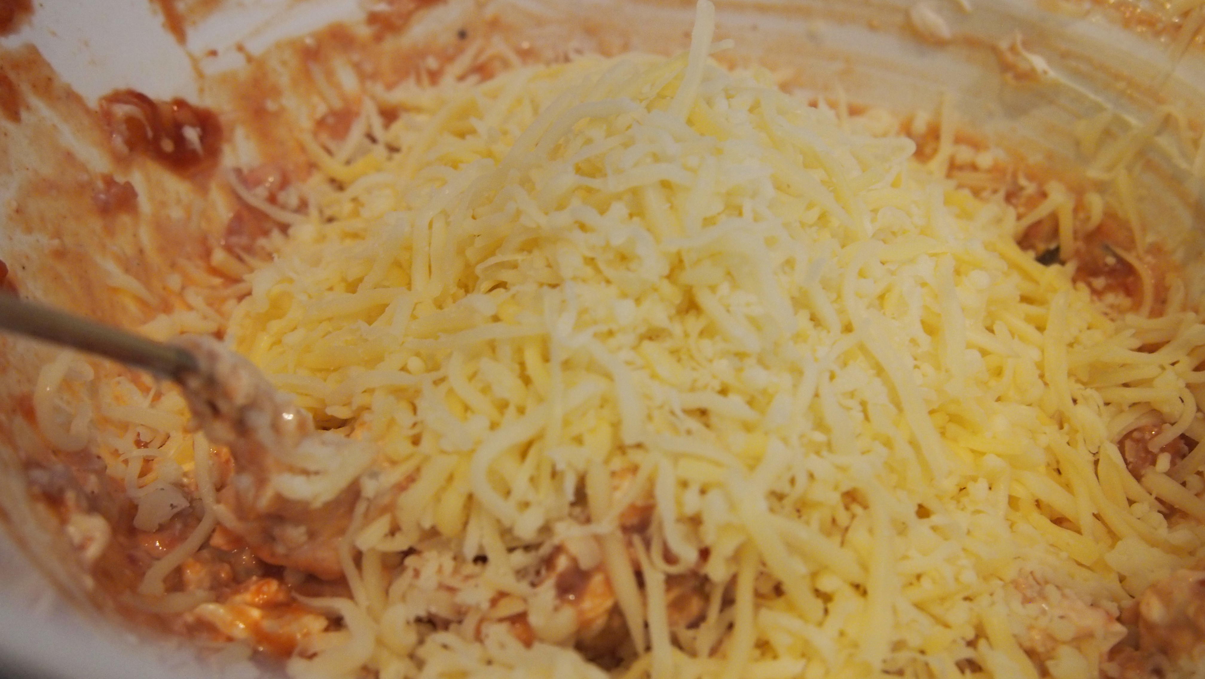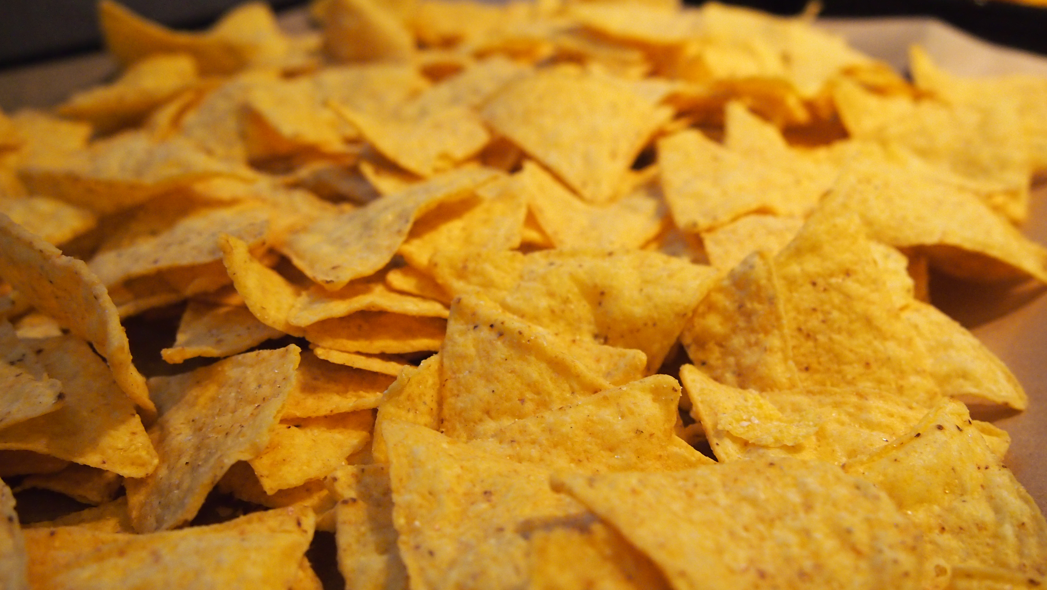 Paistos on helposti muokattavissa. Sen voi tehdä kasvisversiona, ruokaisampi versio syntyy tacomaustetulla jauhelilhalla tai sitten täytteen lisäksi sekaan voi heiteillä katkarapuja. Variaatioita löytyy, me teimme jauheliha- ja katkarapuversiot. Levitä ensin maissilastuja leivinpaperilla vuoratulle korkeareunaiselle uunipellille ja laita uuni kuumenemaan 200 asteeseen. Paista jauheliha valmiiksi ja mausta se tacomausteella tai haluamallasi tavalla. Valmista varsinainen täyte.