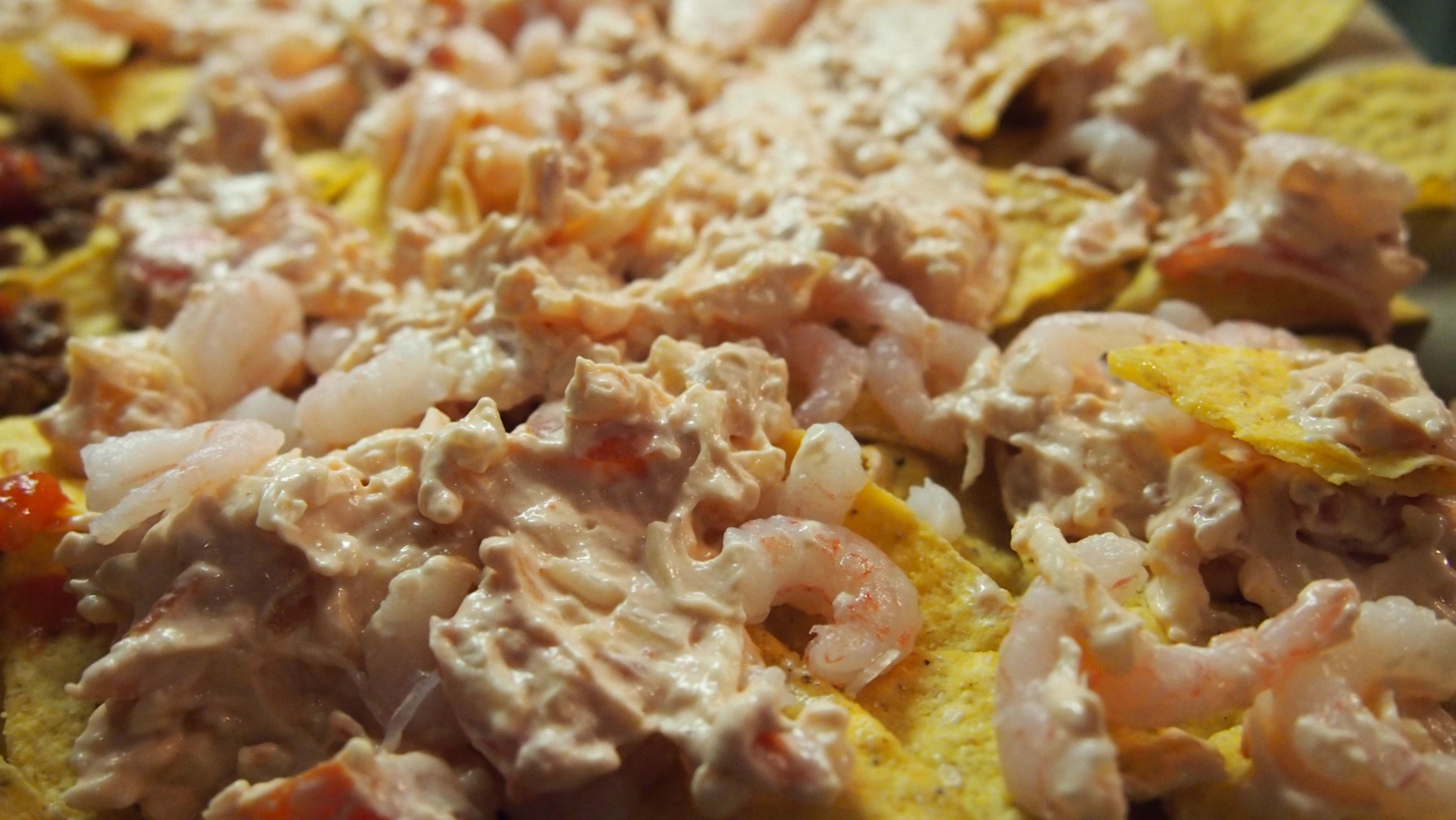 Sekoita täytteen aineet keskenään. Lisää nachojen päälle jauheliha ja levitä täyte tasaisesti lihan päälle. Kasvisversio syntyy pelkällä täytteellä, ravut voi lisätä levitetyn täytteen päälle. Tämän jälkeen sirottele vielä yksi pussillinen juustoraastetta koko komeuden päälle ja paista uunissa n. 15 minuuttia, kunnes juusto on sulanut ja saanut vähän väriä pintaan. Tarjoa heti raikkaan salaatin kanssa.