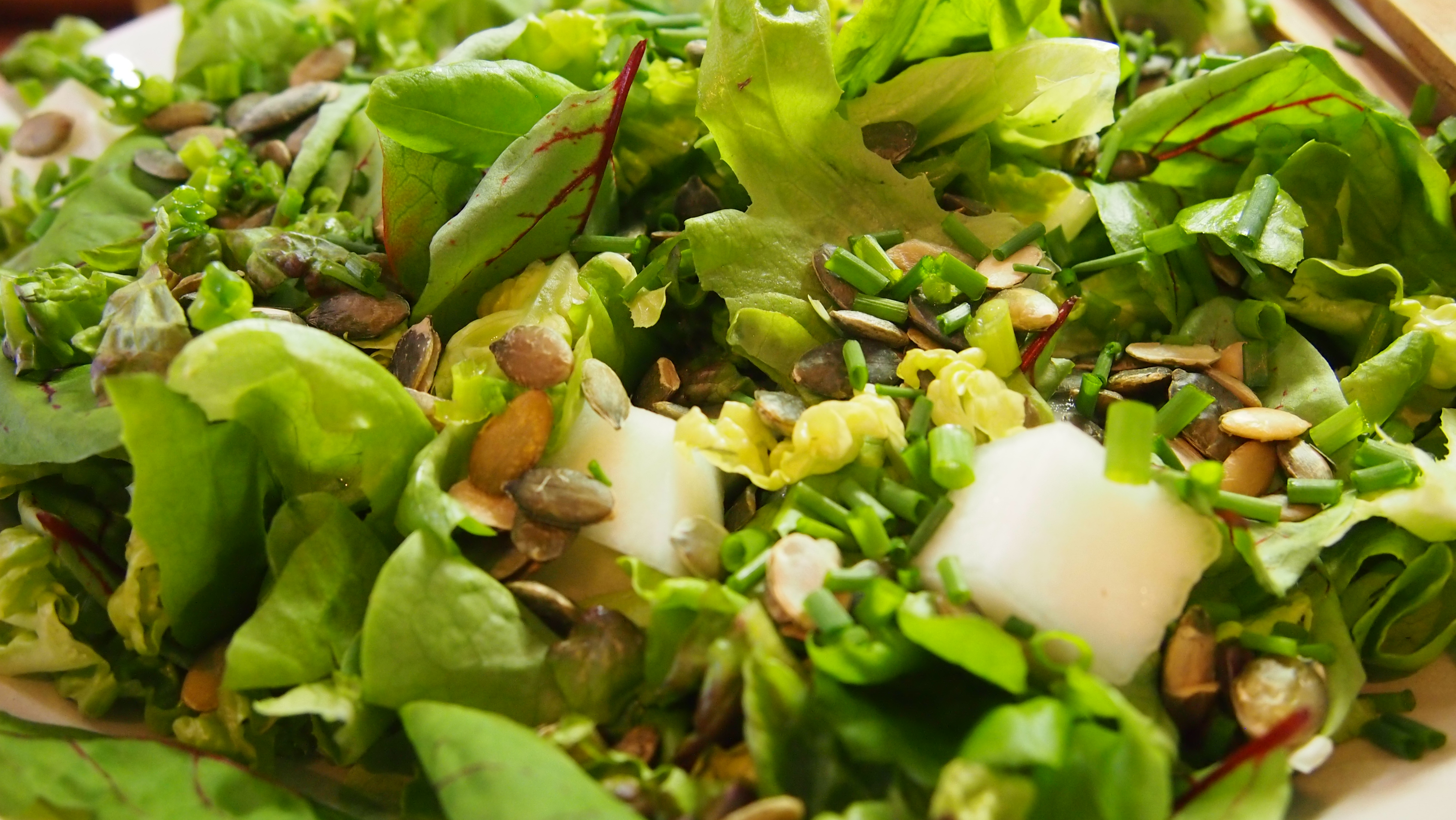 Vihersalaatti hunajamelonilla ja paahdetuilla kurpitsansiemenillä