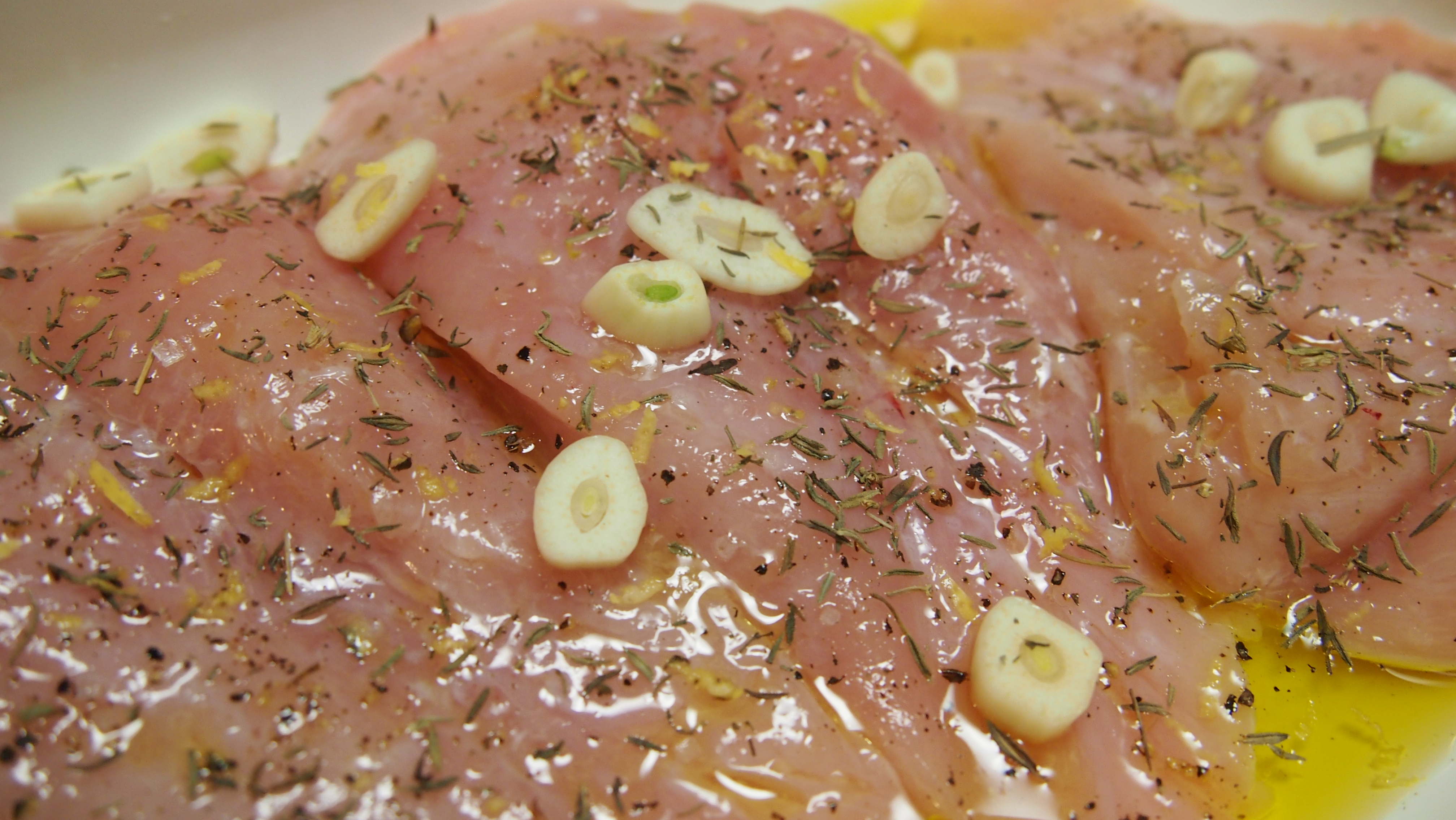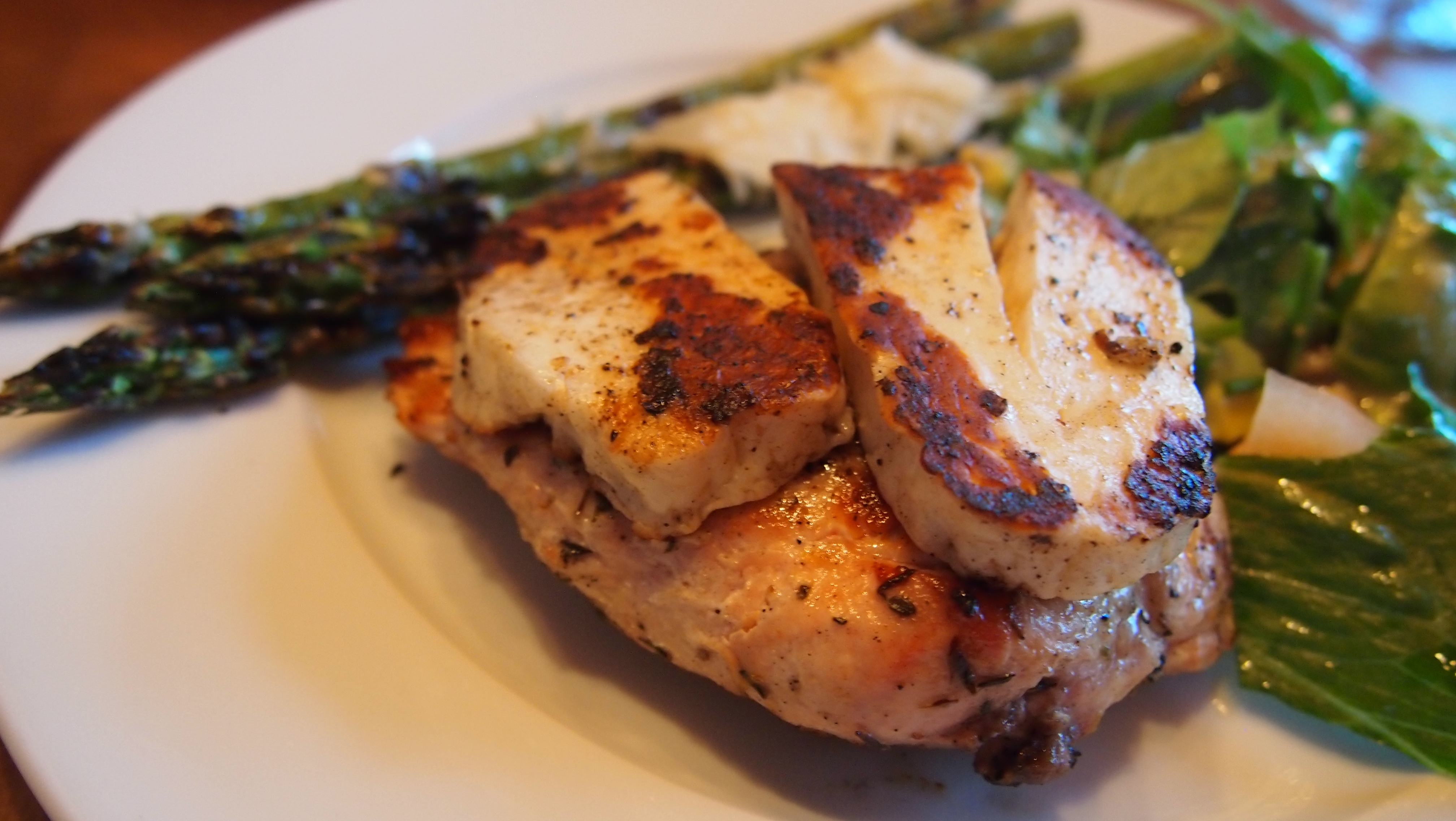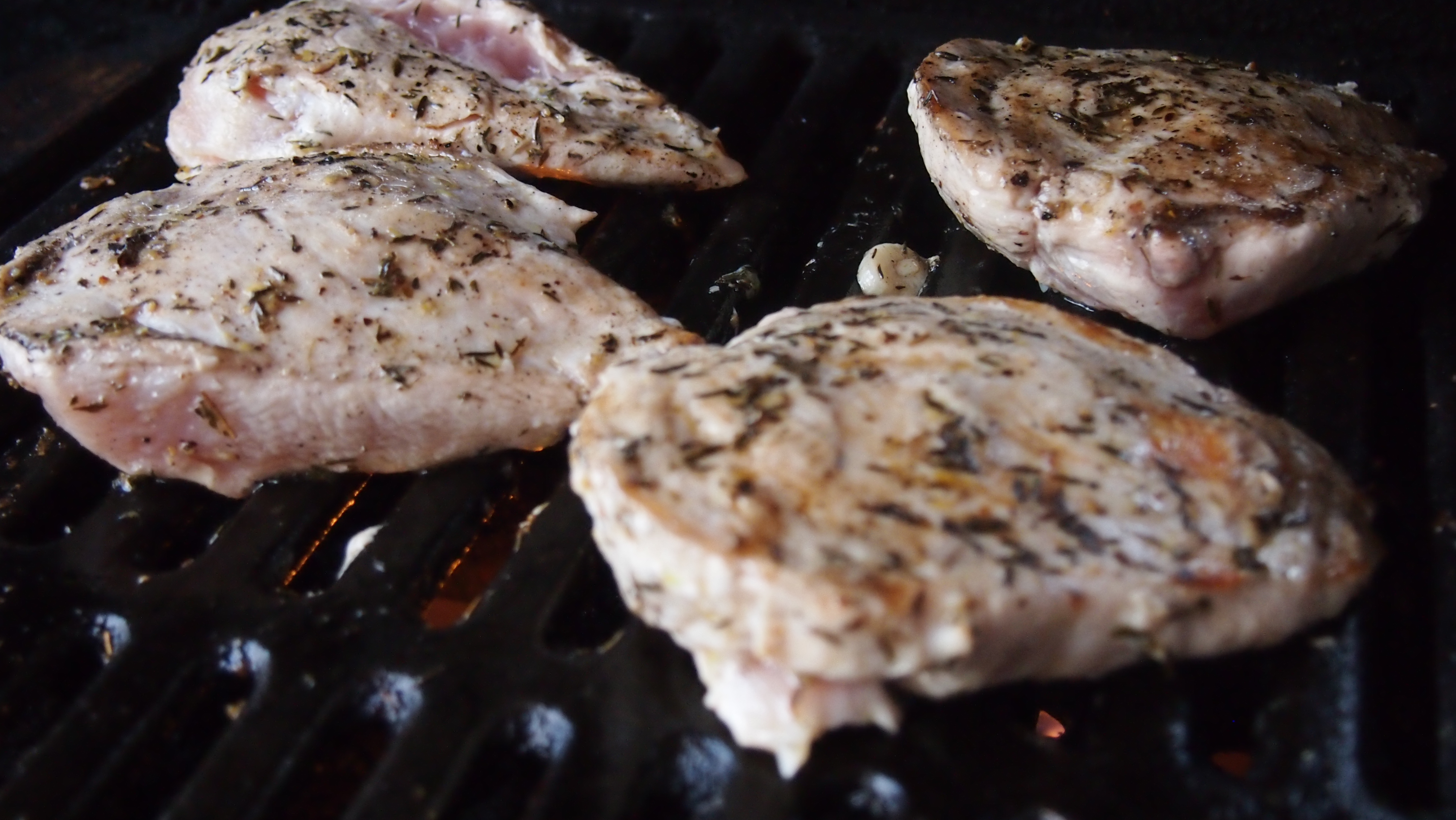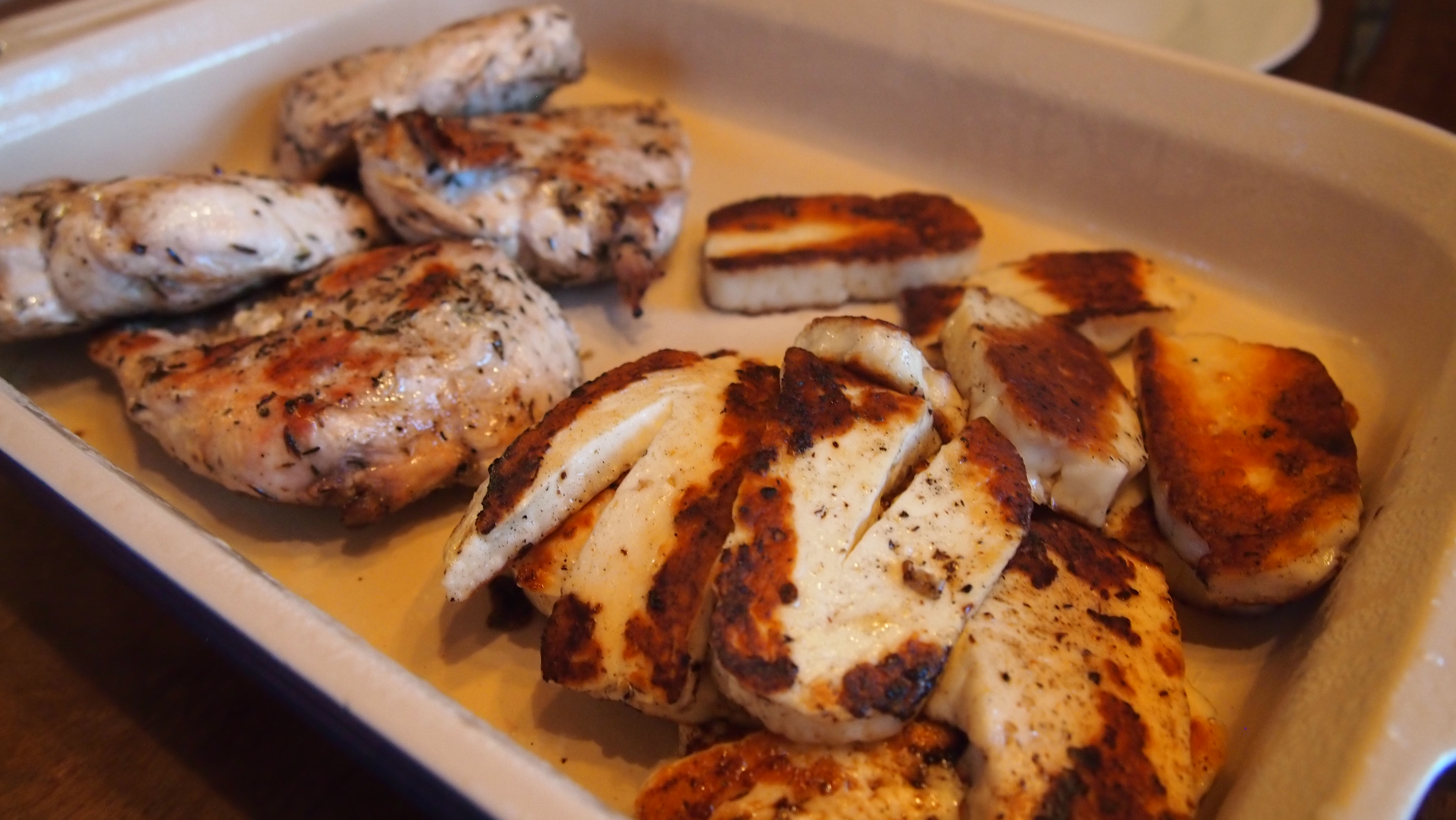 Silppua valkosipuli pieneksi ja sirottele se kanojen joukkoon. Lisää oliiviöljyä niin että kanat ovat kunnolla oliiviöljyssä. Lisää pari ruokalusikallista balsamicoa, runsas nippu silputtua, tuoretta timjamia sekä suolaa ja pippuria niin, että kanat maustuvat kunnolla. Purista joukkoon sitruunan mehua ja sitruunankuorta maun mukaan. Me laitoimme 4 fileeseen yhden sitruunan mehun ja puolikkaan kuoren. Sekoita huolellisesti ja anna marinoitua yllä mainittujen aikojen mukaan. Grillaa kanat kypsiksi (n. 15 minuuttia välillä käännellen) ja lisää grillauksen loppuvaiheessa grilliin myös hallomiviipaleet. Niille kannattaa ennen grillausta vähän pirskotella oliiviöljyä, etteivät tartu grilliin kiinni, sekä ripaus mustapippuria mausteeksi. Grillaa juustot molemmilta puolin kauniin kullanruskeiksi.