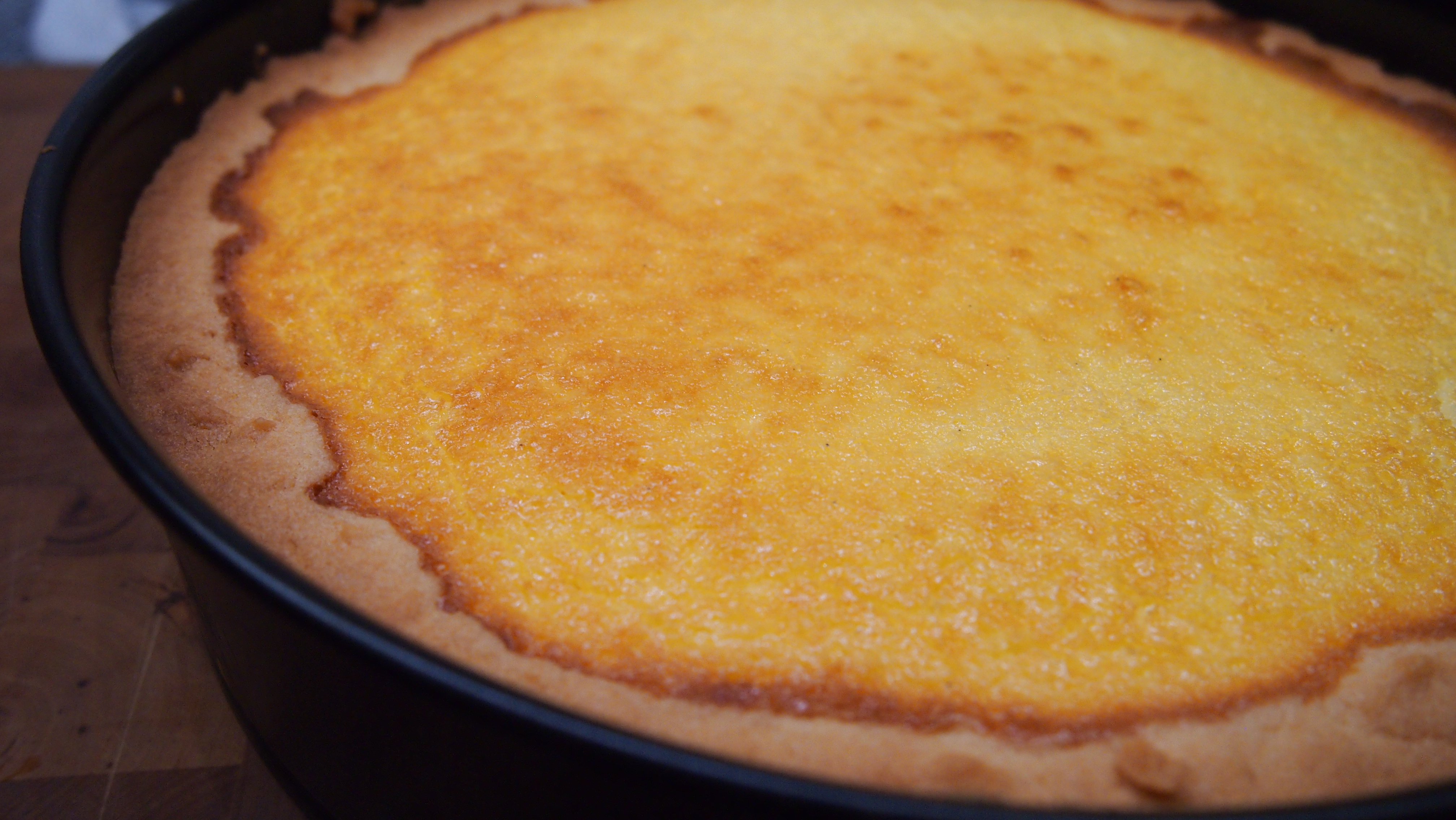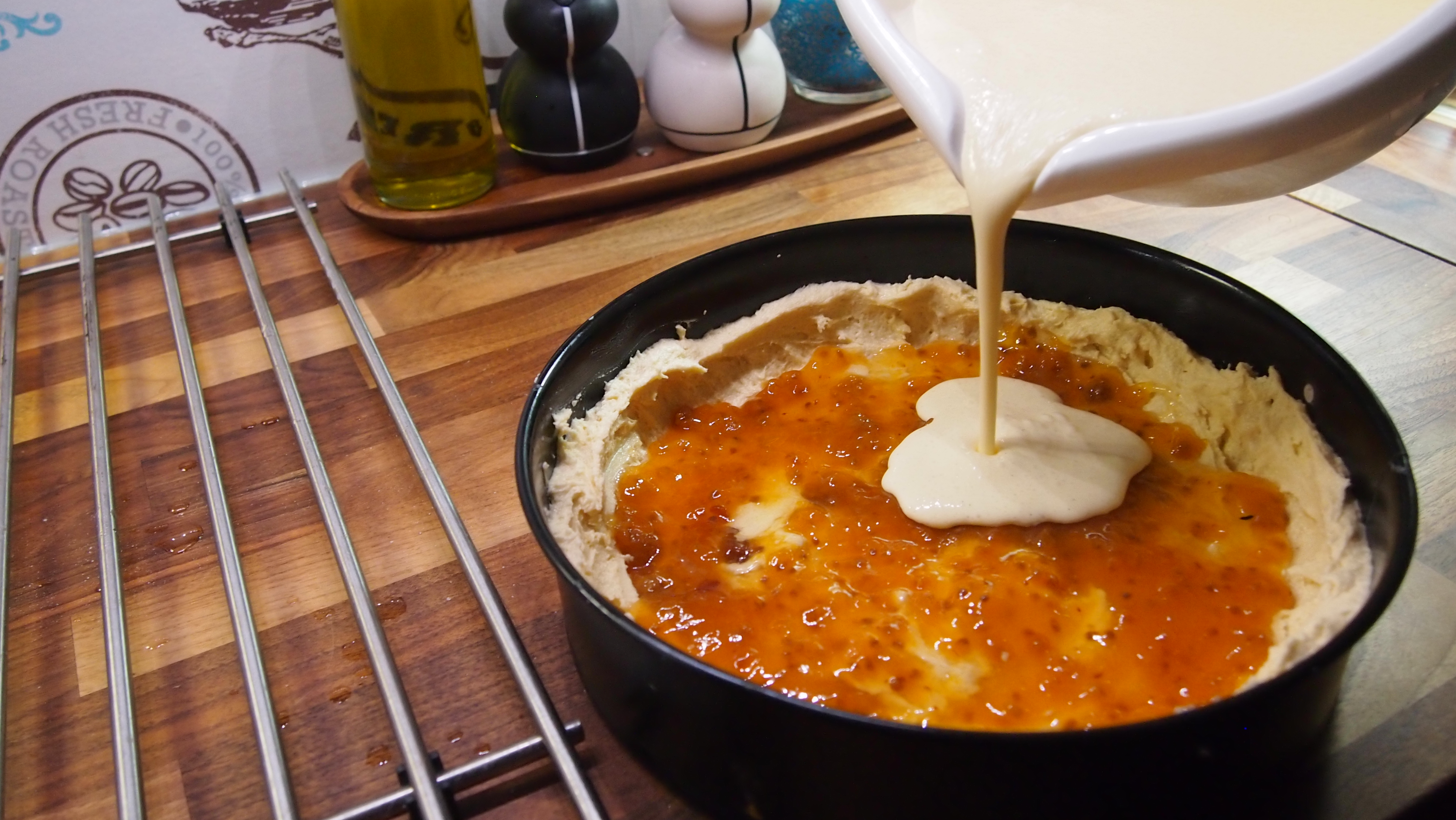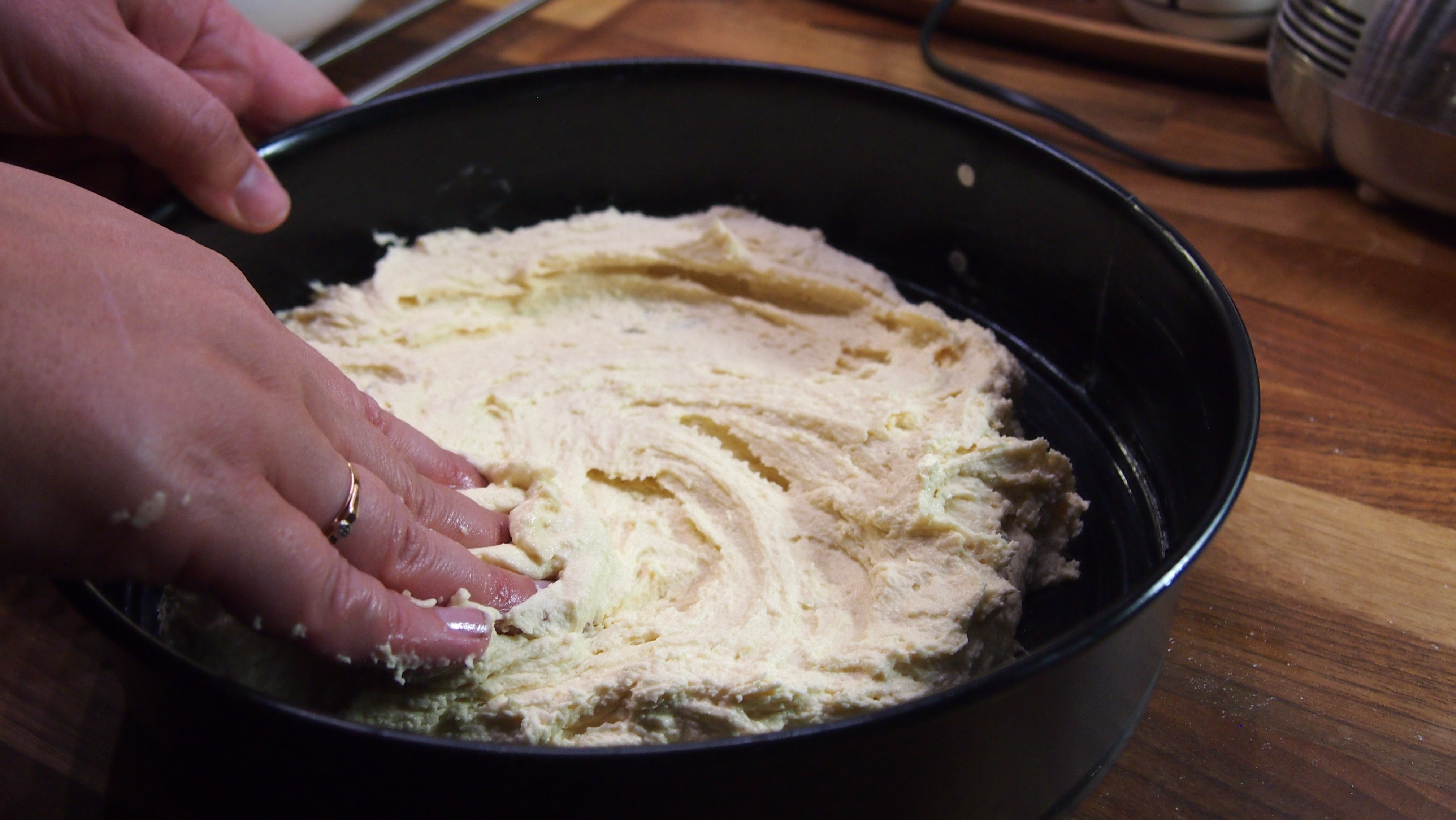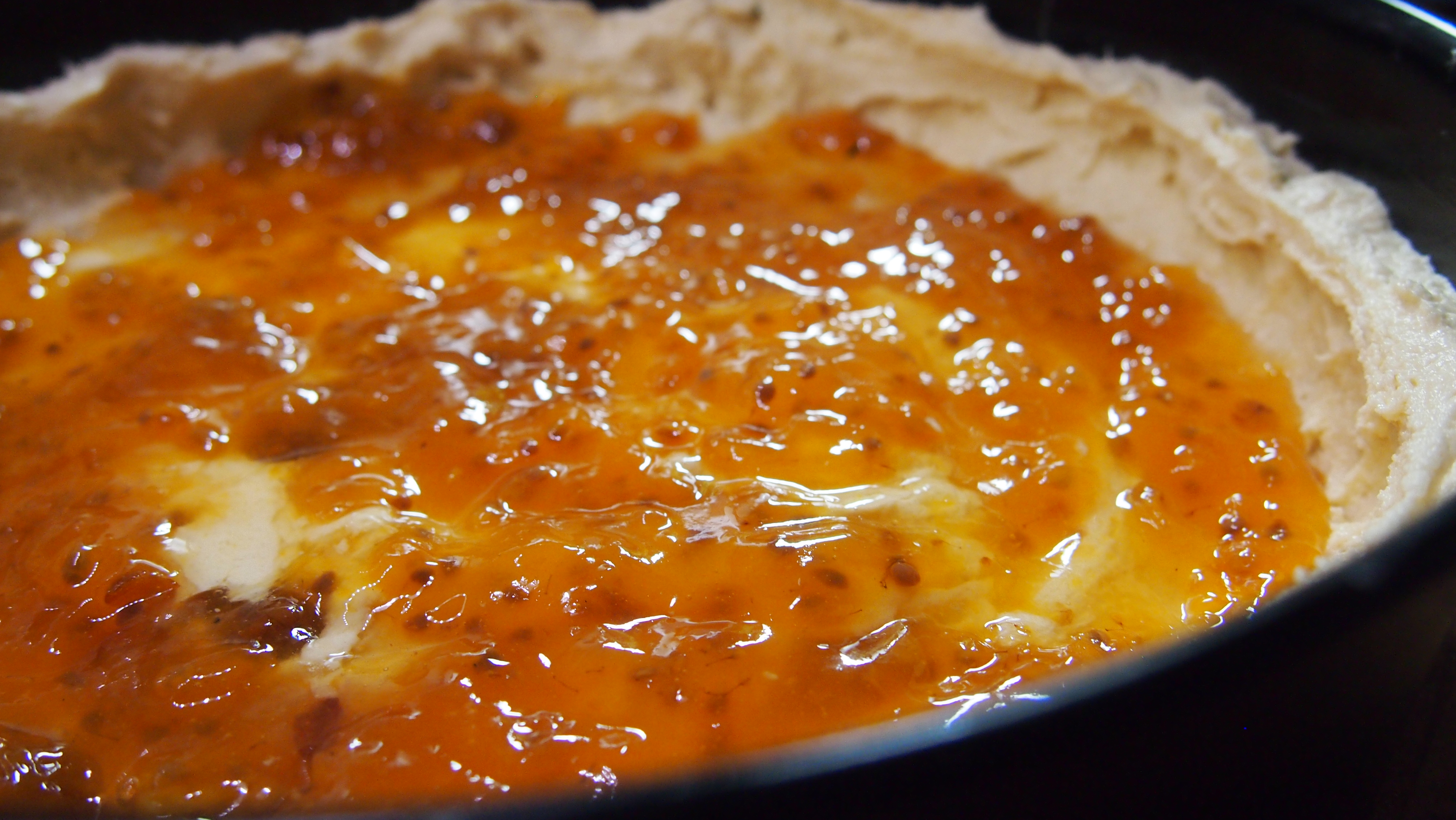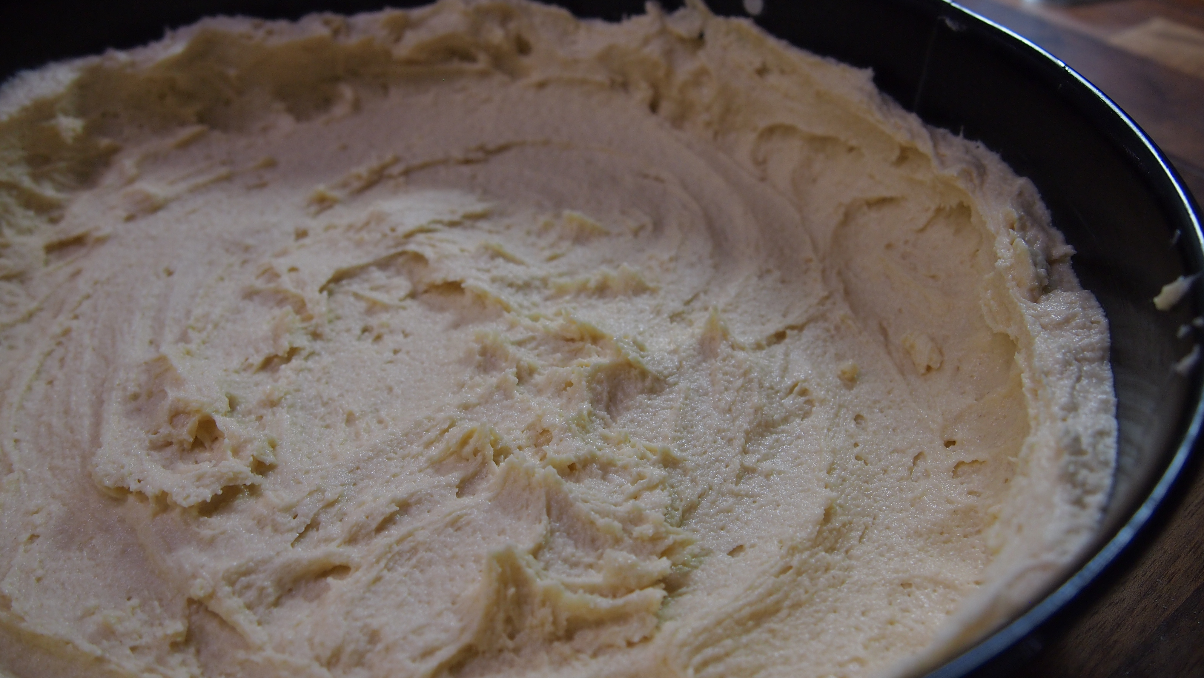 Laita uuni lämpenemään 170 asteeseen. Sekoita kaikki pohjan huoneenlämpöiset aineet vatkaimella kuohkeaksi vaahdoksi. Ihannevatkausaika 5 min. Ja niin, hyvä vinkki tähän! Meillä aina tuppaa unohtua ottaa kananmunat pöydälle lämmittelemään, niin ne lämpiää mukavasti ja nopeasti, kun ne laittaa hetkeksi kuumaan veteen lillumaan. Kun pohja on vatkattu, levitä se hyvin voideltuun, halkasijaltaan 24 cm irtopohjavuokaan. Tee taikinasta myös noin 4 cm reunat. Levitä hillo taikinan päälle.
