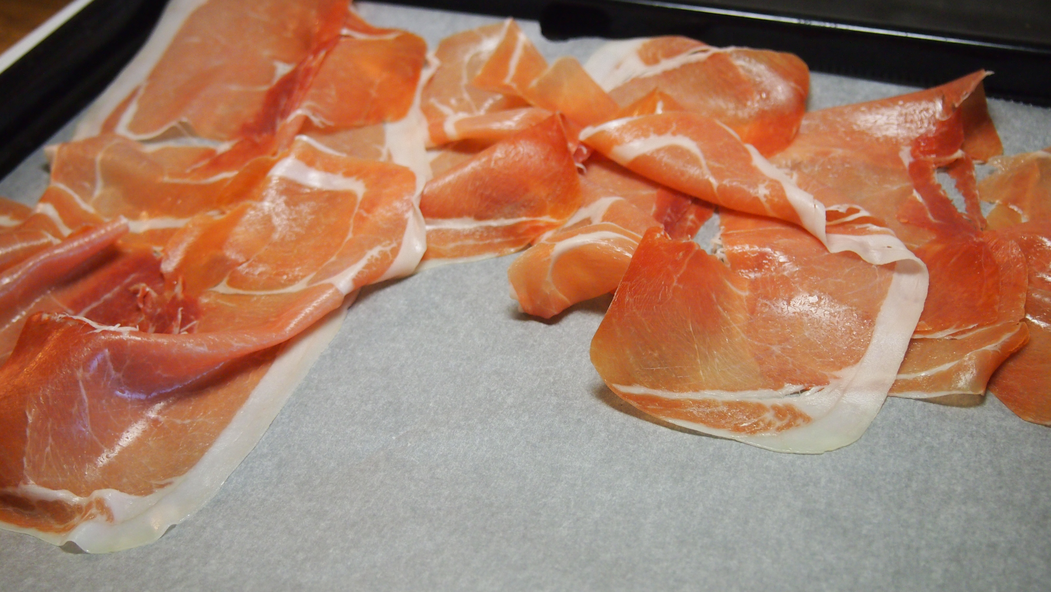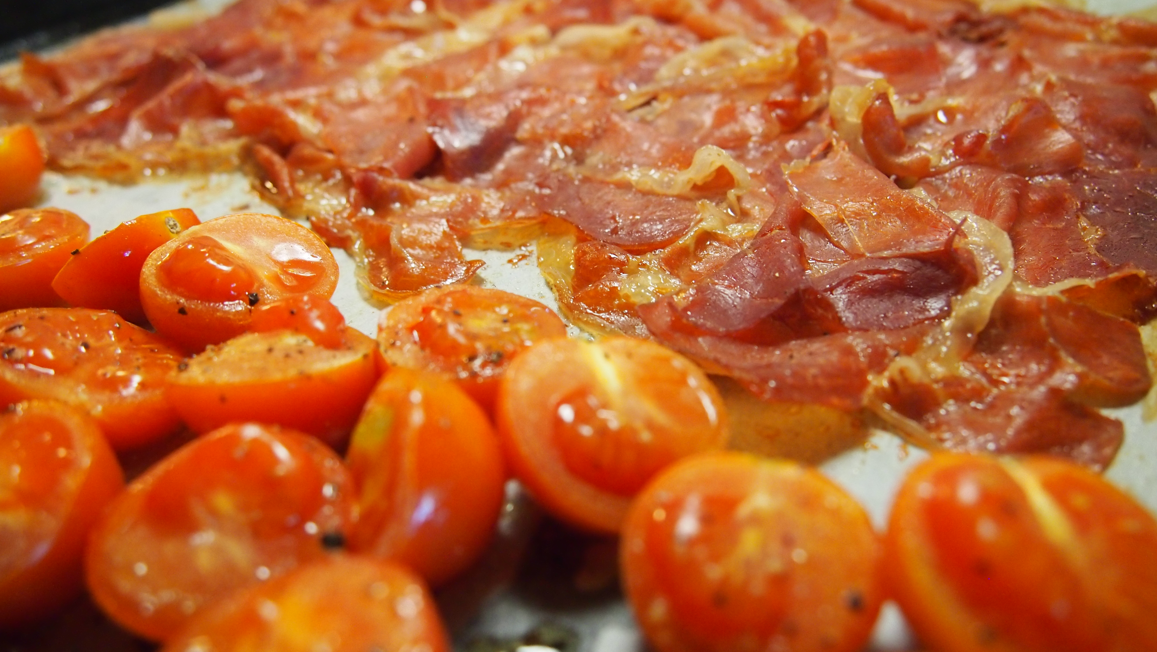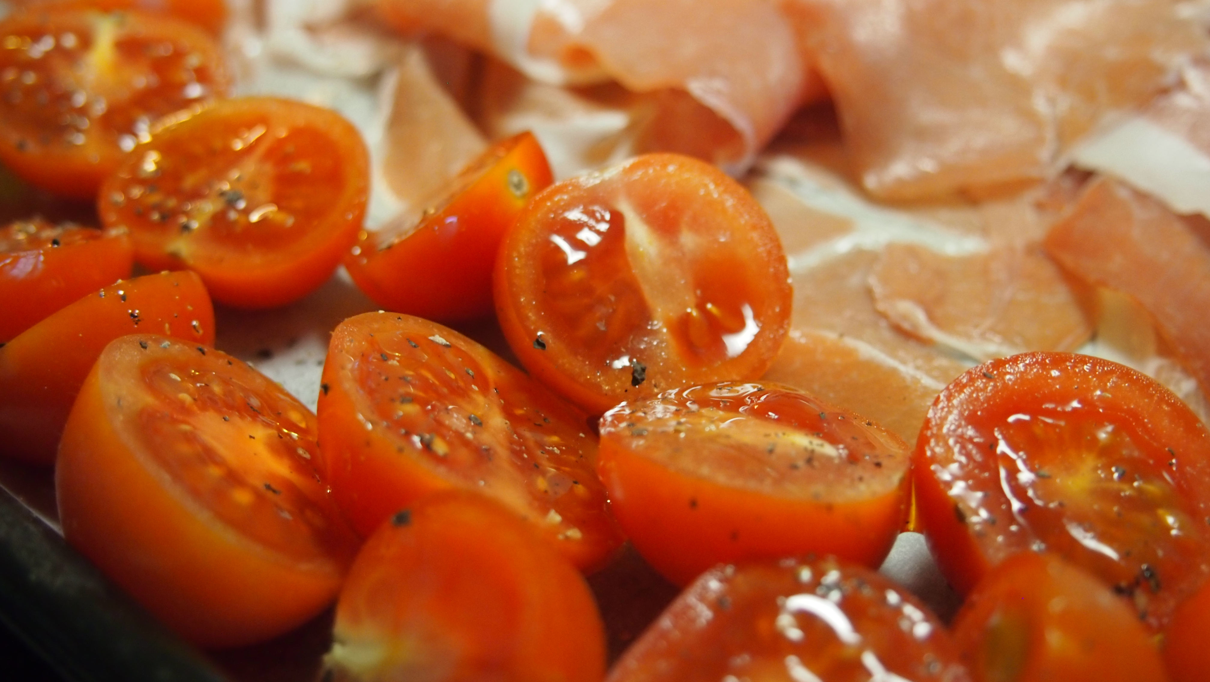 Levitä kinkkuviipaleet leivinpaperin päälle pellille. Halkaise kirsikkatomaatit ja lisää ne myös pellille leikkauspinta ylöspäin. Valuta tomaateille oliiviöljyä ja rouhi päälle ripaus mustapippuria. Paista uunissa 225 asteessa 10 min. Anna jäähtyä.