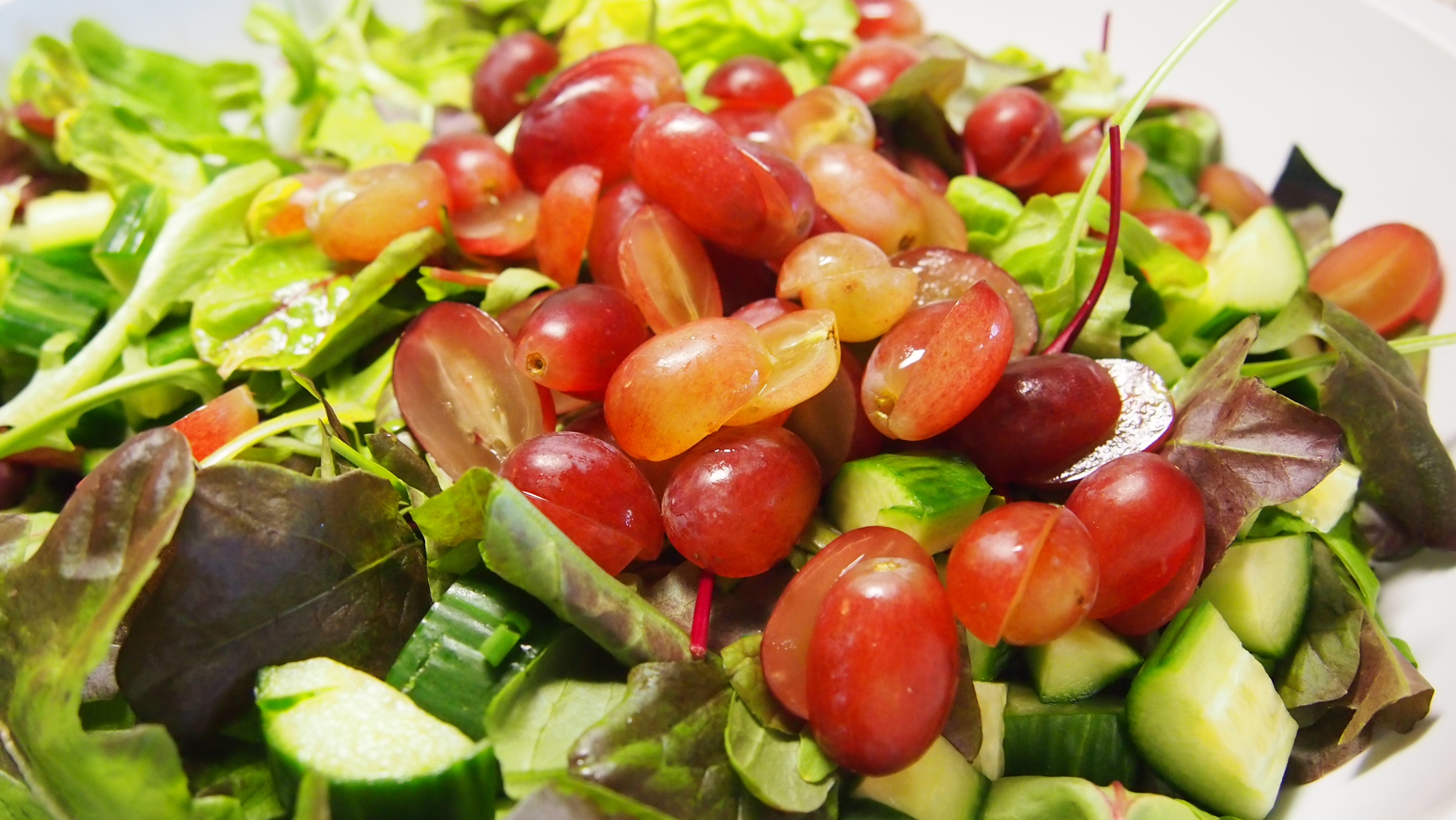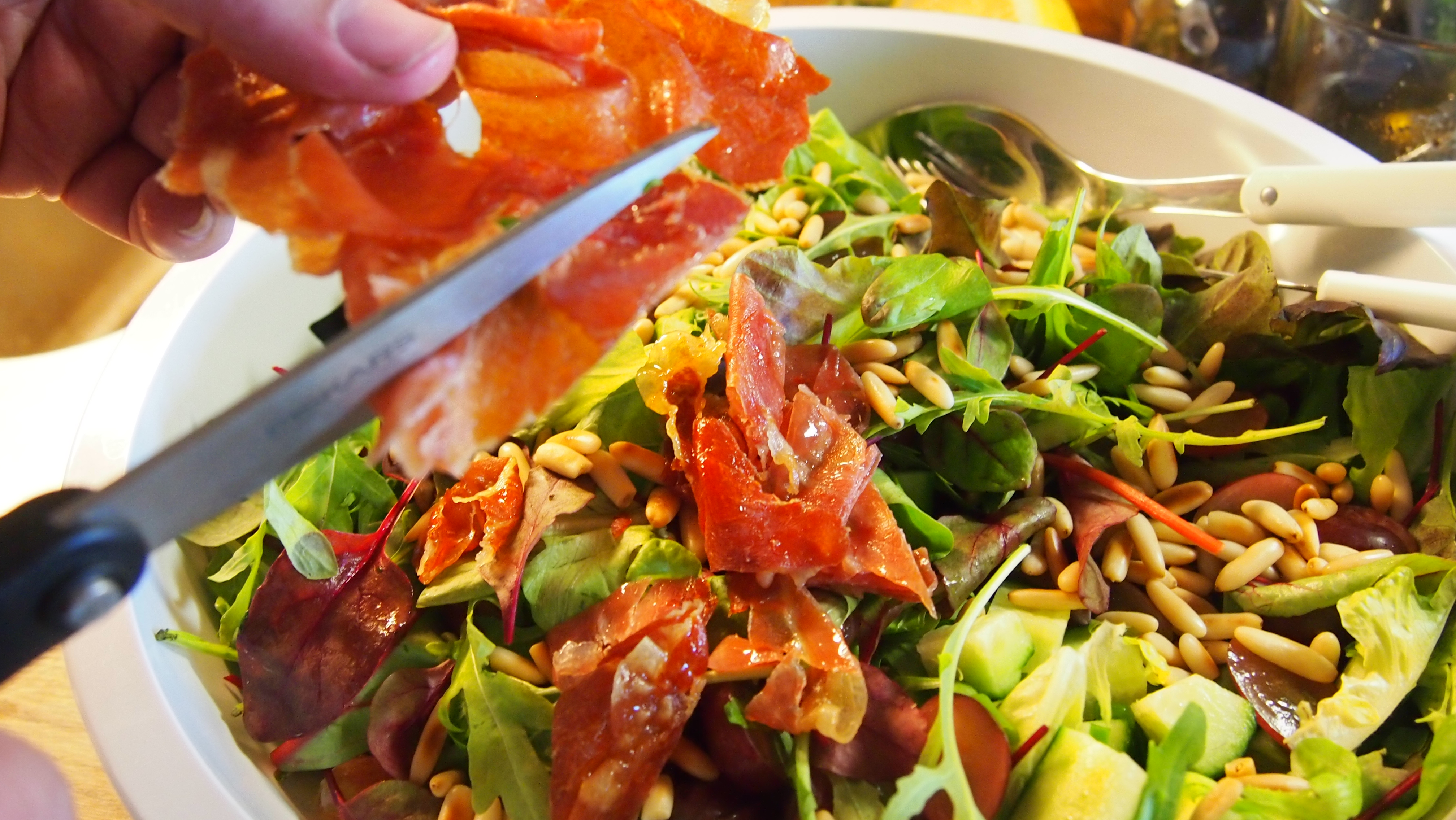 Salaatin ohje on peräisin jumppakamulta ja se on loistava kesäsalaatti; siinä yhdistyy hyvällä tavalla viinirypäleiden makeus ja parmankinkun suolainen maukkaus. Kokkailussa oli apuna kissanpentumme pörröinen veli.