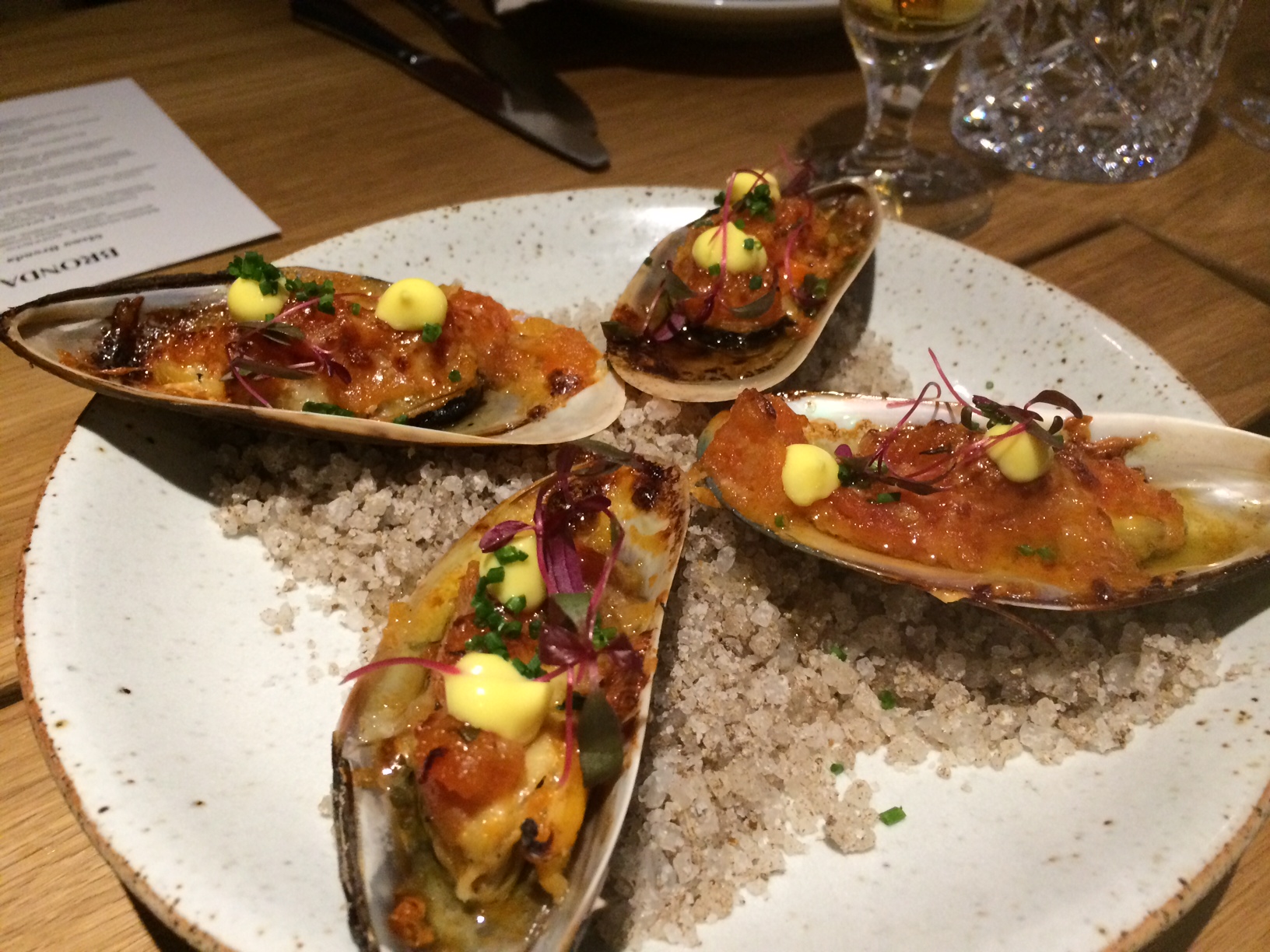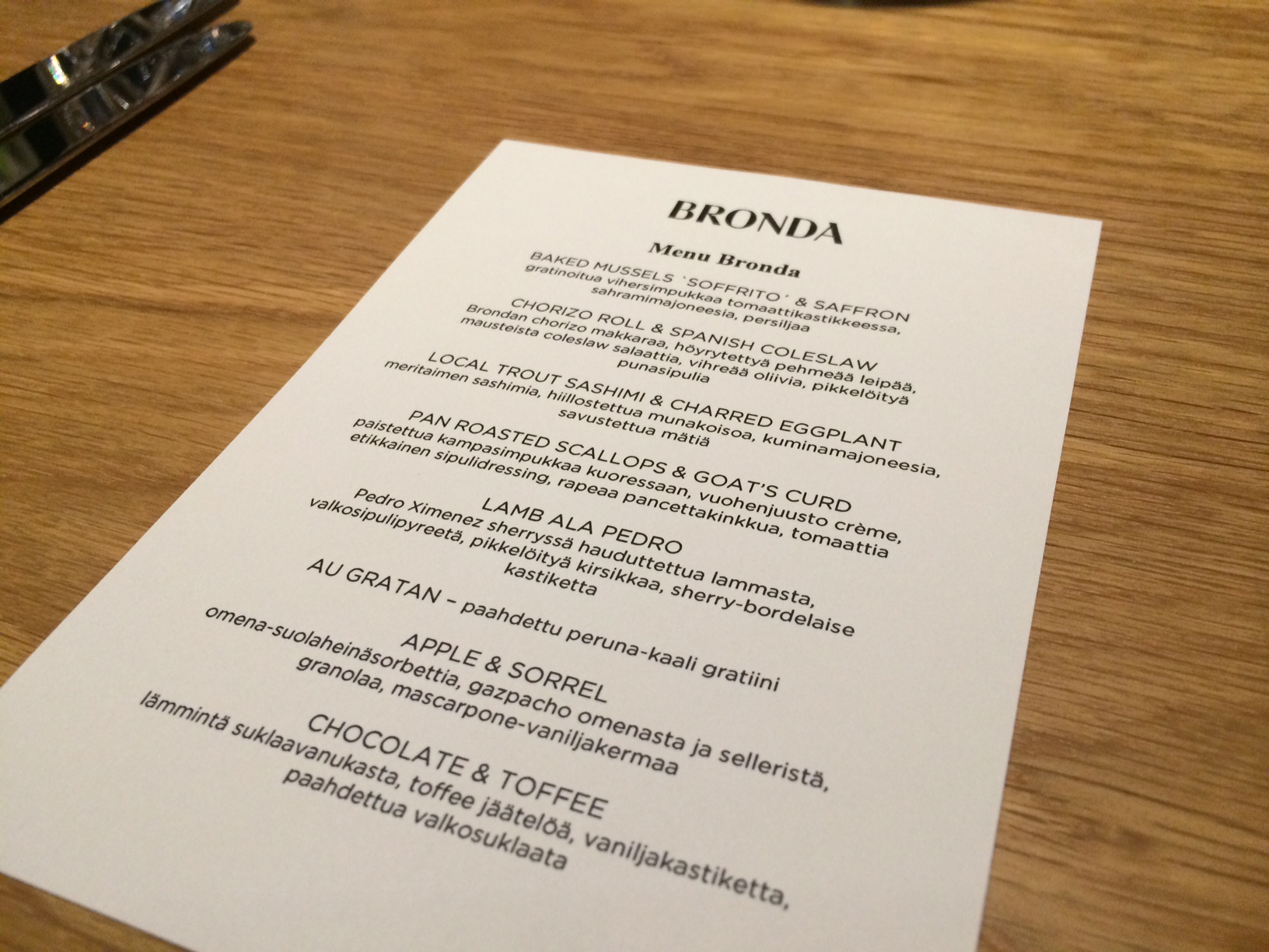 Tarjoilija suositteli seurueellemme Menu Brondaa, joka on 7 ruokalajin maistelumenu. Tämä menu antaa hyvän kuvan siitä mitä Bronda on. Ravintola itse luokittelee keskittyvänsä Eurooppalaiseen ruokaan, erityisesti italialaisiin, espanjalaisiin ja ranskalaisiin makuihin. Menu oli hyvä ja maistuva kokonaisuus, eikä jättänyt ketään meistä kylmäksi.
