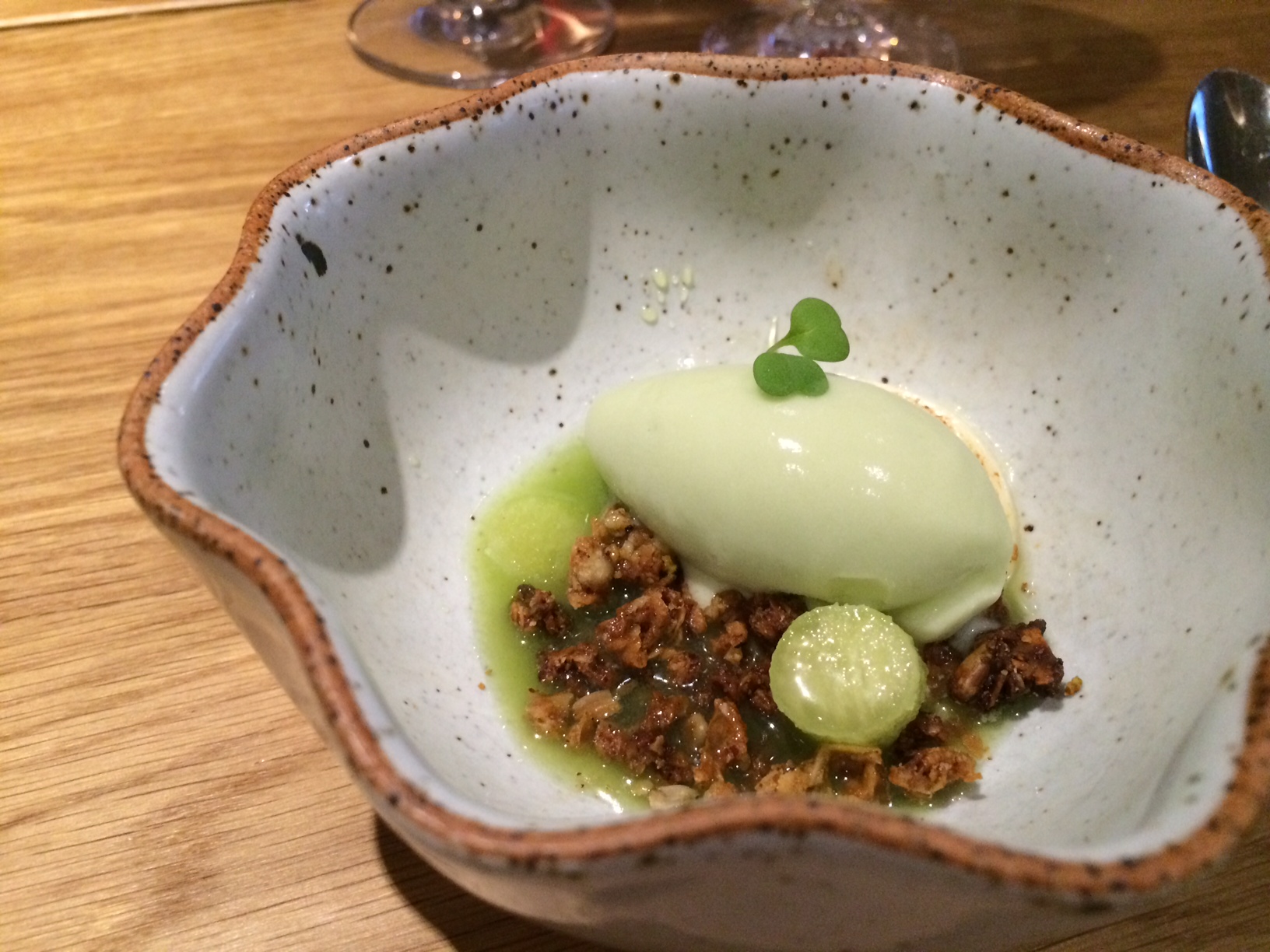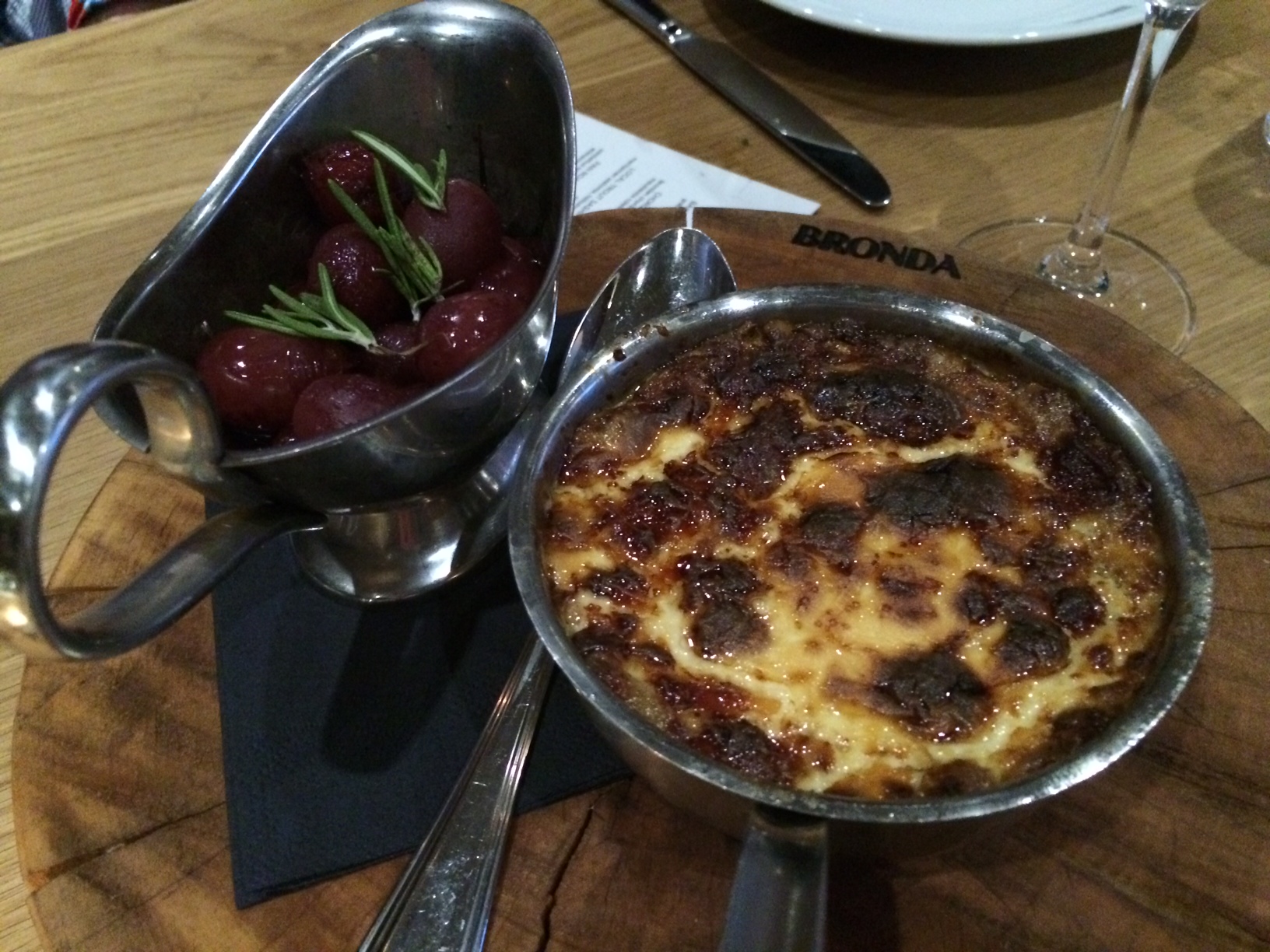 Pääruuaksi nautiskeltiin ylikypsäksi haudutettua lammasta ja perunakaaligratiinia. Perunakaaligratiini oli vähän mauton, mutta lammas sitäkin mureampi ja suussa sulavampi. Pikkelöidyt kirsikat antoivat kokonaisuudelle kivan lisän. Kaiken tämän jälkeen herkuttelimme vielä omena – suolaheinäsorbetilla sekä suklaavanukas -toffeejäätelöllä. Kaikki ruuat maistuivat seurueellemme ja tunnelma ravintolassa oli iloinen ja eläväinen. Viinit oli valittu hyvin ja osa varsin kekseliäästi ruokiin sopiviksi. No, tässä tapauksessa varmasti kuvat puhuvat enemmän kuin tuhat sanaa.