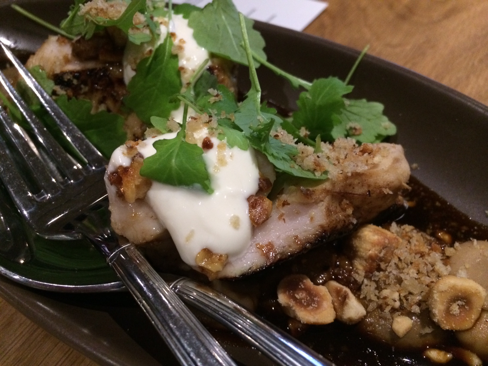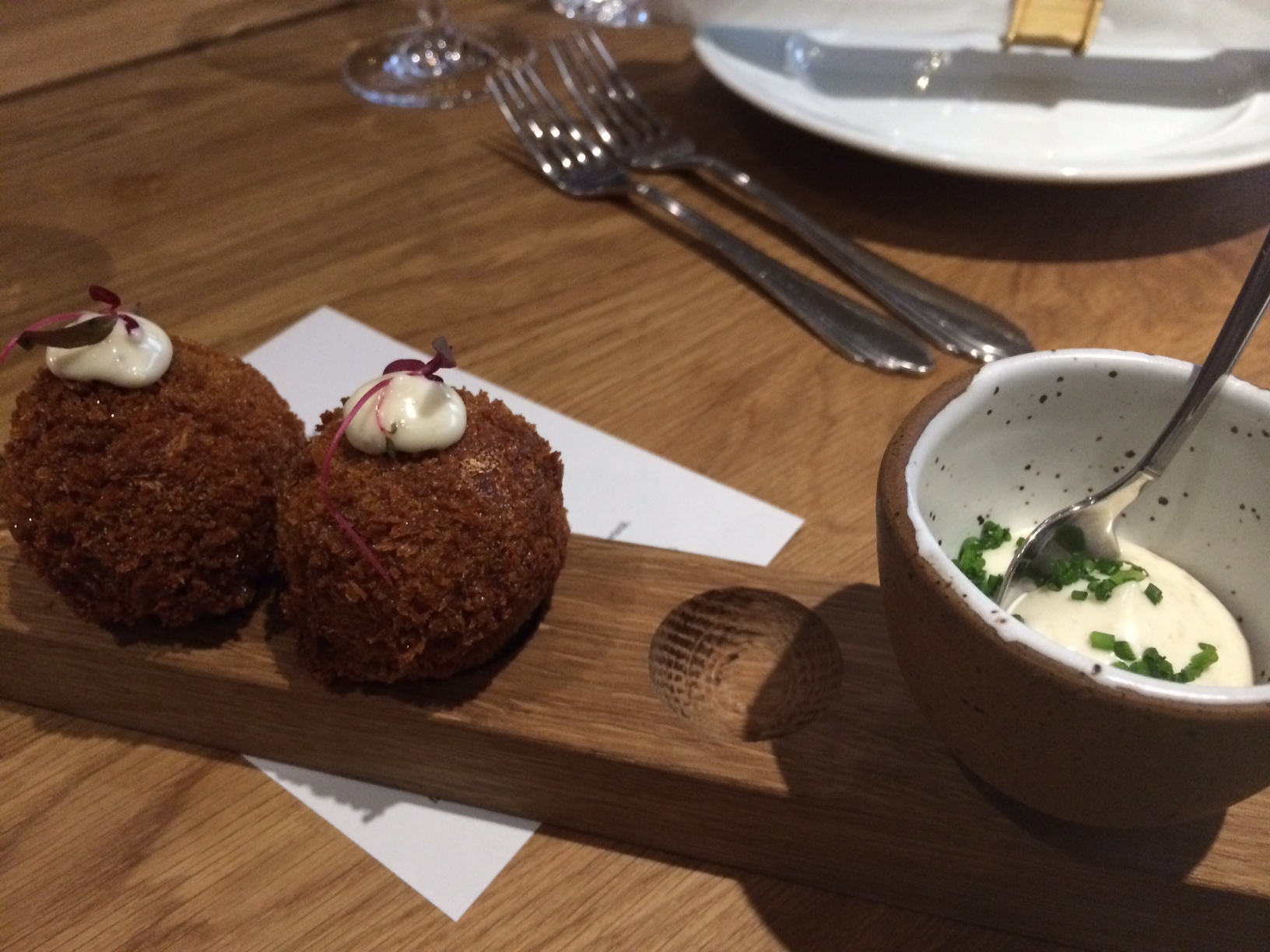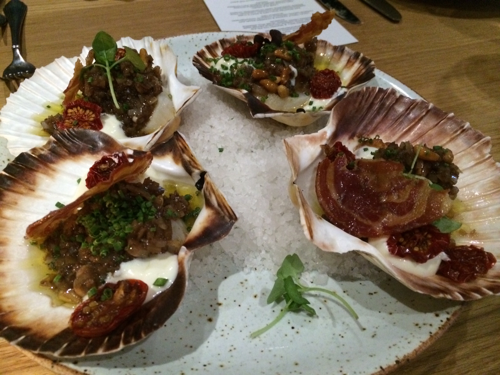 Alkuruokien kokonaisuus koostui parista eri simpukka-annoksesta, chorizohodarista ja lohisashimista. Meille ei mereneläviä syöville tarjoiltiin sipukoiden sijaan rapeaksi friteerattu pallo, jossa oli riisiä, sieniä, yrttejä ja sitruunaa sekä kananpoikaa savumajoneesilla ja tummalla pähkinäisellä kastikkeella. Alkupaloista voiton vei chorizohodari, kun taas kampasimpukka-annos hurmasi ennenkaikkea kauneudellaan.