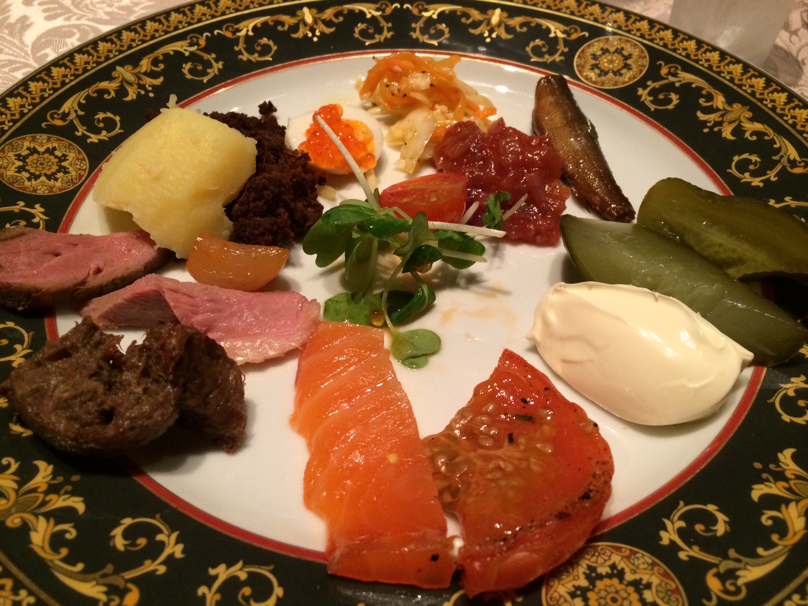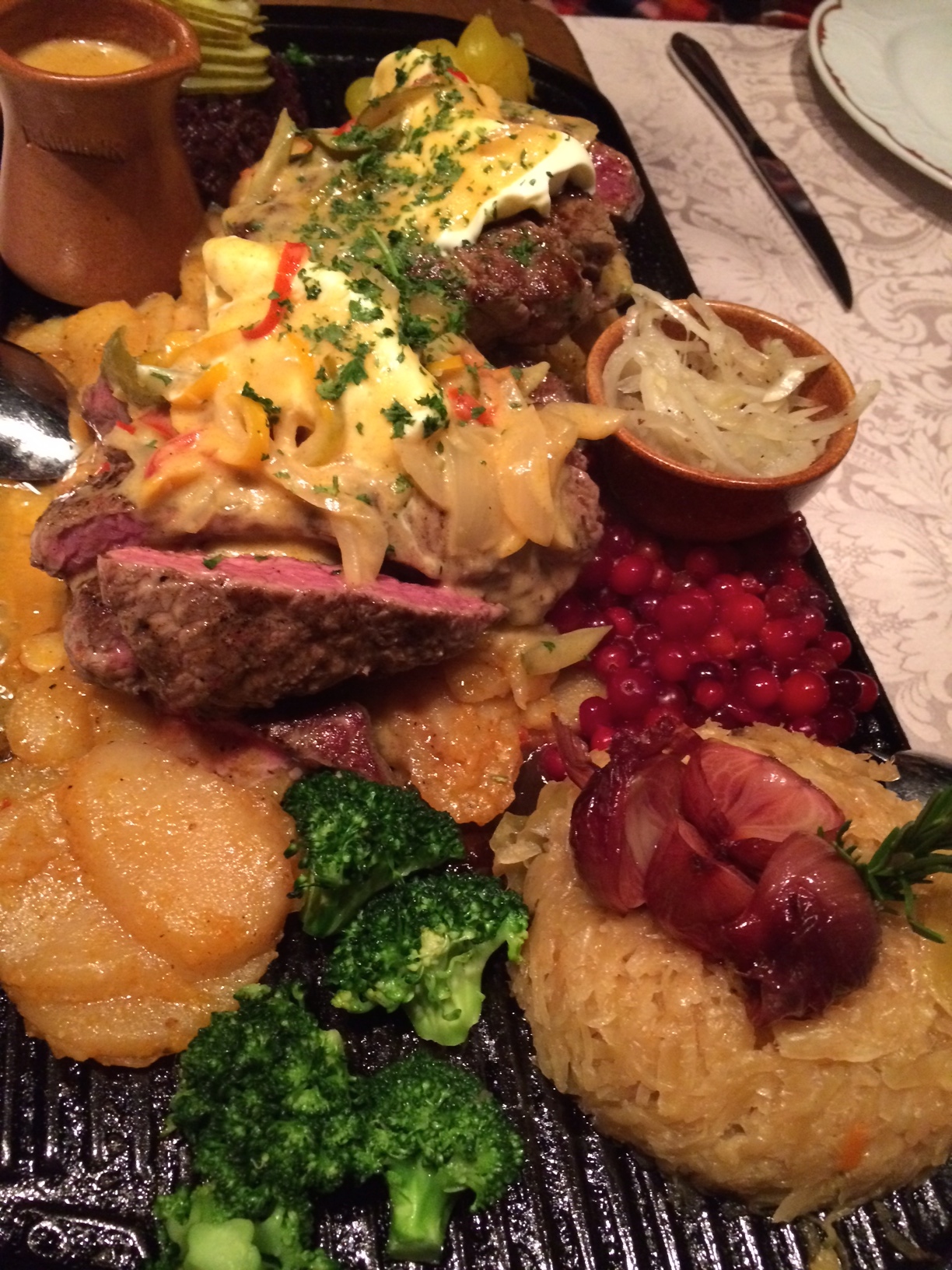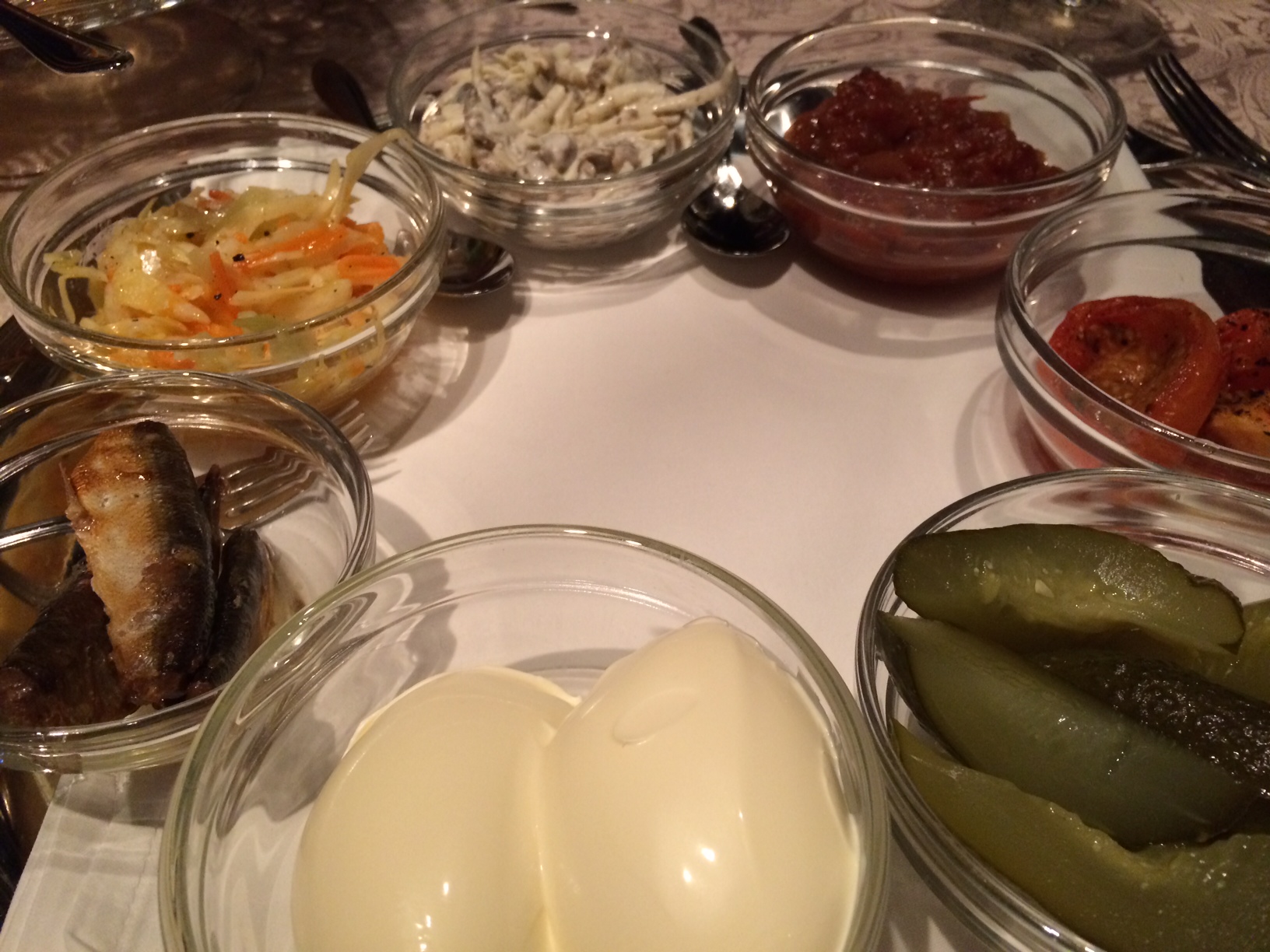 Minä olin ensimmäistä kertaa Saslikissa ja senkin perustella päädyimme kaikki syömään ravintolan klassikkomenun. Alkuun tarjoiltiin lajitelma erilaisia venäläisiä alkupaloja, joiden myötä pääsi hyvin venäläiseen makumaailmaan kiinni. Pääruokana oli maustehärkää venäläiseen tapaan valkosipuliperunoilla ja maustekurkku-paprikakastikkeella. Menu huipentui Katariina Suuren uunijäätelöön, jota saimme nauttia venäläisten trubaduurien laulujen siivittämänä. Voi vaan todeta että ravintola Saslik tarjosi meille mielettömän elämyksen, niin ruuan kuin tunnelmankin puolesta! Iso kiitos vielä illan isännälle ja emännälle ♥