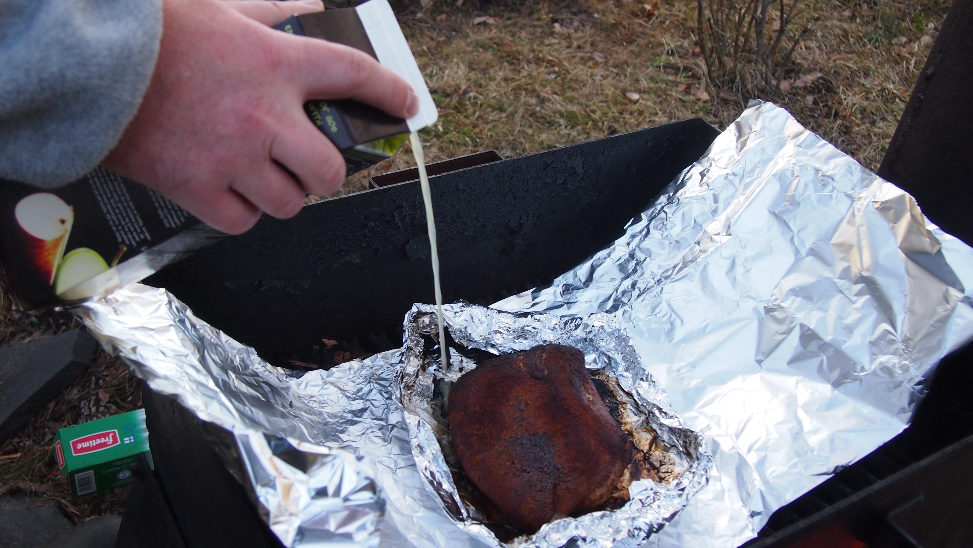 Mausta liha red rubilla vähintään 4 tuntia ennen kypsennyksen aloittamisesta. Vaikka red rubissa on suolaa, koemme että se ei ole ihan riittävä määrä suolaamaan lihaa kunnolla.  Lisäisimmekin lihan pintaan vielä suolaa antamaan extramakua. Liha pitää ottaa paria tuntia ennen savustuspönttöön menoa huoneenlämpöön. Liha asetellaan folion päälle ja laitetaan savustuspönttöön kypsymään. Juuri ennen lihaa, heitellään muutama kourallinen savustuspurua savustusastiaan. Paiston aikana leppäsavupurua tulee lisätä tasaisin väliajoin, jotta savua riittää. Liha saa kypsyä miedolla tulella 3-4 tuntia, kunnes sen sisälämpötila on 80 astetta. Lihan kypsyessä oli hyvää aikaa tehdä vähän pihahommia mökillä, sekä kalastaa.