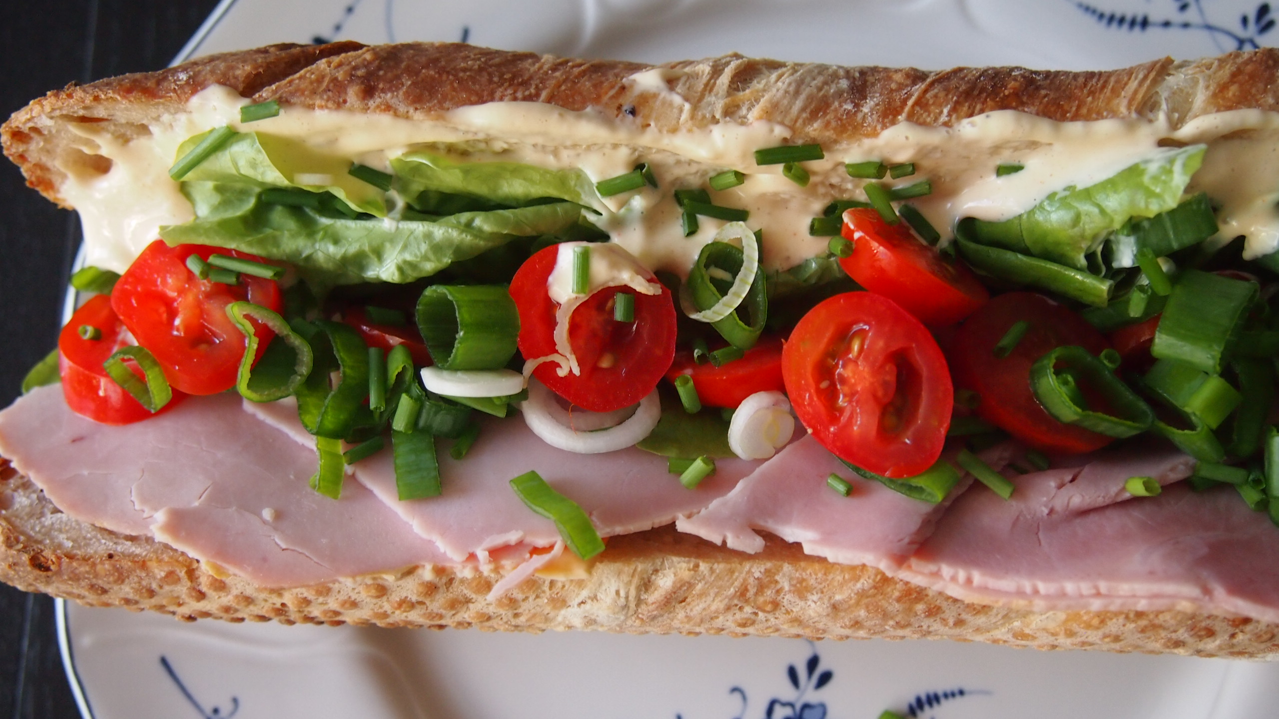 Valmista ensin valkosipulimajoneesi. Ohjeet löytyvät TÄÄLTÄ. Pilko tomaatit, kesäsipulit ja ruohosipulit. Halkaise patongit, lado pohjimmaiseksi kinkkua ja juustoa, lisää sipulit ja tomaatit sekä viimeistele majoneesilla. Sitten ei muuta kuin ääntä kohti, kyllä maistui!
