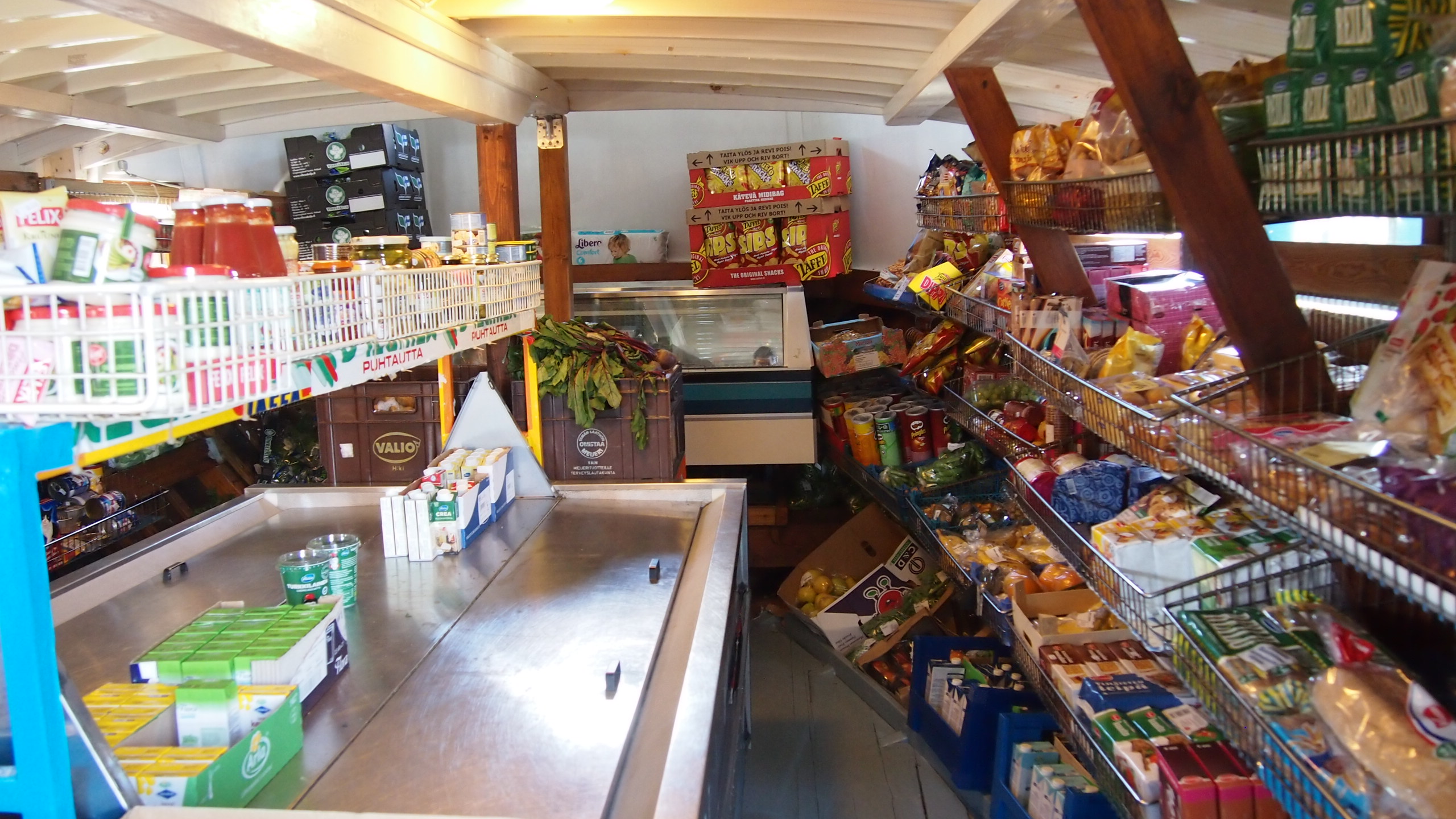 Kauppalaivassa kuljetaan jonossa ja toimitaan ripeästi, jotta laiva pääsee ajoissa jatkamaan matkaa seuraavaan laituriin. Tavallaan se on vähän sääli, sillä siellä olisi kiva hengailla hetken pidempäänkin ja ihmetellä valikoimaa. Mutta kauppa se on mikä kannattaa. Valikoiman tähtiä ovat tuoreet munkit, marjat ja tietenkin jäätelö. Joten saaristolaiset, käykää jatkossakin kauppalaivalla, jotta tämän kaltaiset palvelut säilyvät! Extrapisteitä saa eräs saaristolaisnainen, joka aina urhoollisesti soutaa ostoksille ja takaisin. Matkaa hänellä kertyy yhteensä noin 6 kilometriä, joten kunnioitettava suoritus varsinkin näissä ihanissa helteissä!