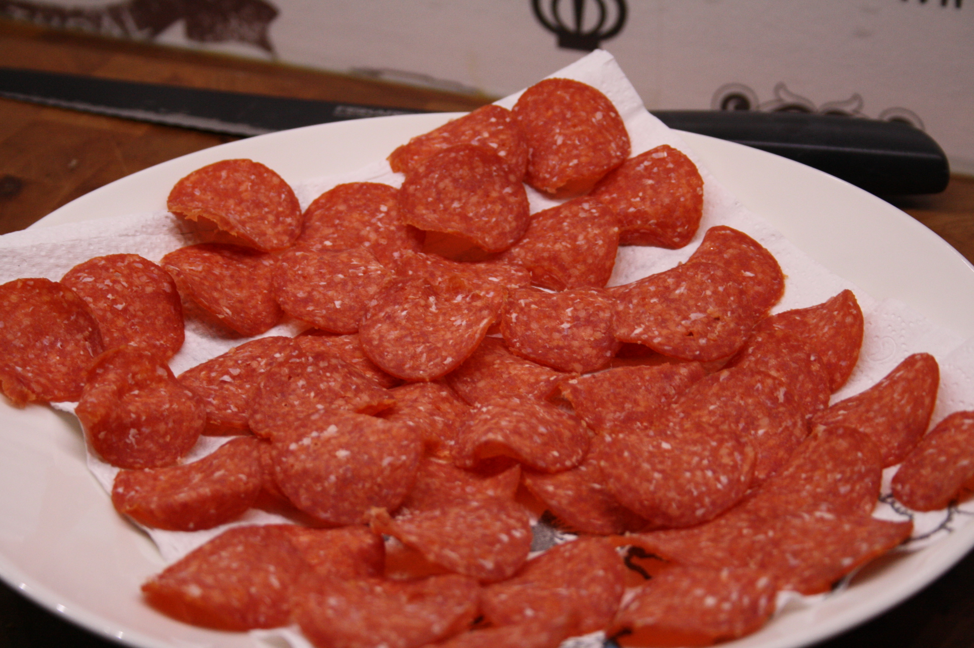 Asettele salamiviipaleet talouspaperille ja laita ne hetkeksi mikroon. Paina niitä toisella talouspaperilla, jotta rasva imeytyy paperiin. Tämä oli hyvä vinkki, sillä toimenpide takaa rapeammat salamiviipaleet valmiissa pizzassa! Levitä pohjalle smetana ja pizzajuustoraaste. Alkuperäisessä ohjeessa laitetaan 1 purkki smetanaa per pizzapohja. Meidän pannun mittoihin se oli mielestäni hitusen liikaa, joten jätin toisesta pohjasta ehkä ruokalusikan verran pois. Mutta makuasioita! Ripottele vielä parmesanraaste ja astettele päälimmäiseksi salamiviipaleet. Mausta suolalla ja pippurilla. Paista uunissa 220 asteessa 15-20 minuuttia. Ja ai että oli herkkua, muutkin lempparitäytteet toimivat tässä myös varmasti.