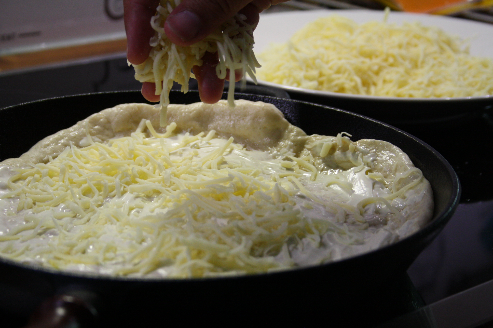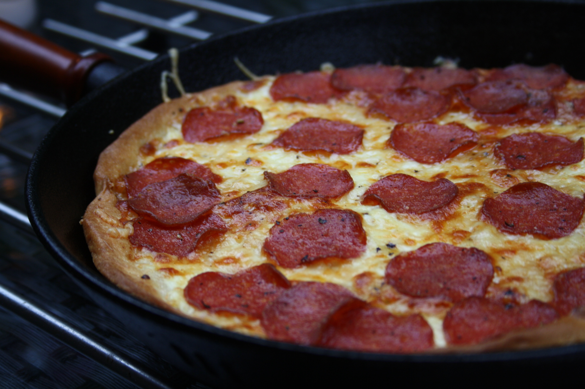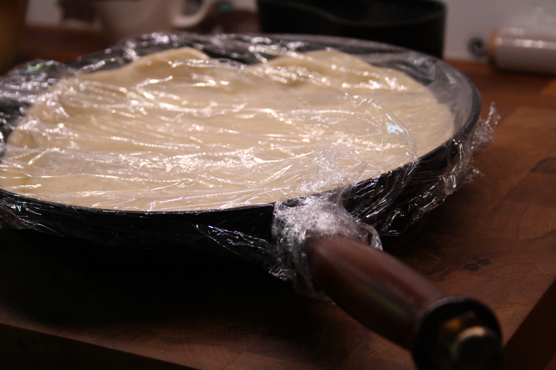 P.S. Meillä kun ei ole kuin yksi valurautapannu, teimme ensin yhden pizzan, söimme ja vasta sen jälkeen paistoimme toisen. Taikina odotteli kulhossa pöydällä ja hyvin onnistui toinenkin pizza odottelusta huolimatta. Yhdestä pannullisesta riittää loistavasti kahdelle, sen verran tuhtia herkkua tämä on.