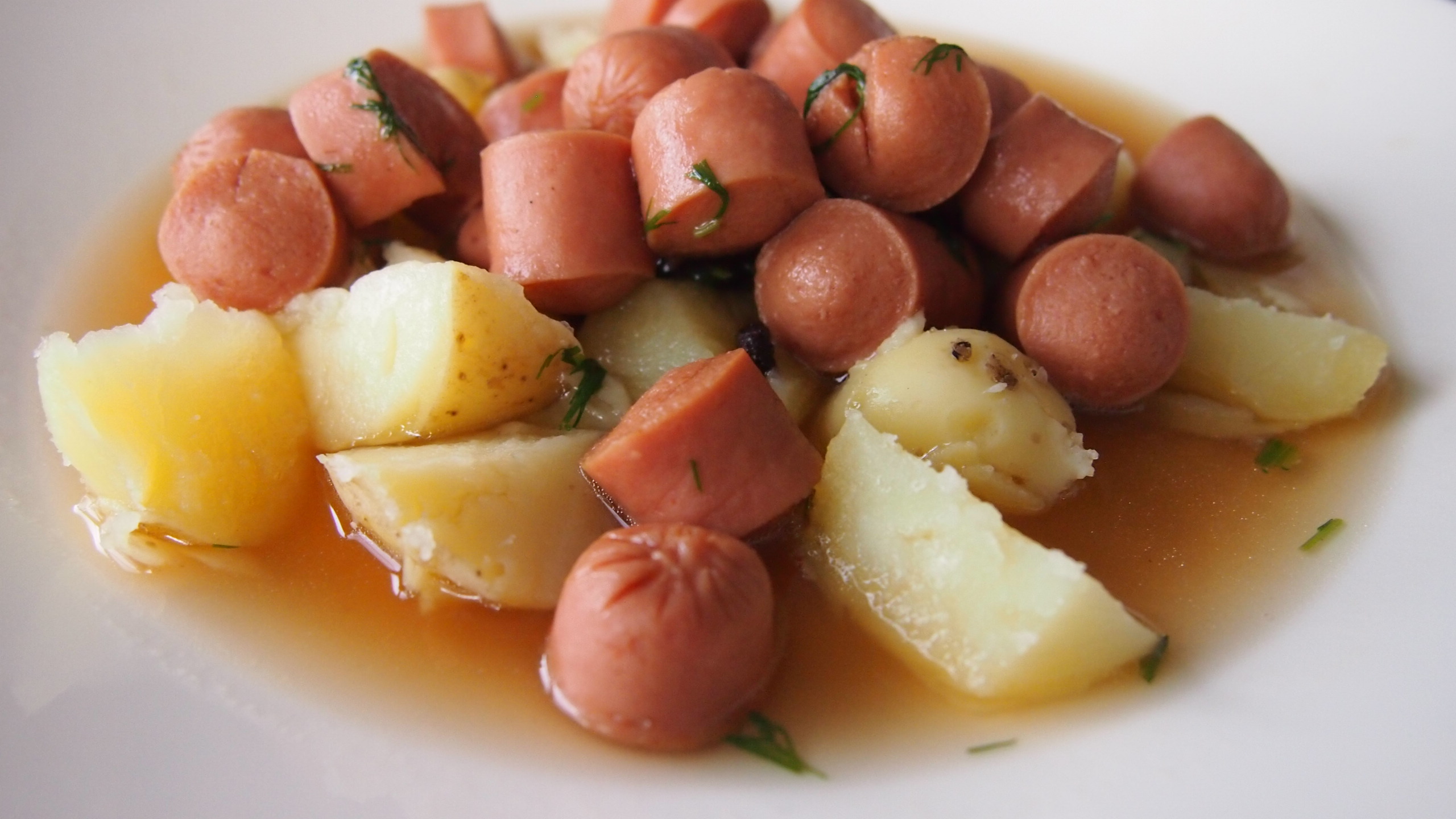Vinkki! Kastikkeen maun salaisuus on tarpeeksi vahva lihaliemi kastikepohjana. Jos teet ohjetta pienemmän satsin, käytä silti 2 lihaliemikuutiota. Itse tykkään muussata perunat lautaselle, jotta liemi oikein imeytyy perunaan. Tähän ruokaan sopii myös aikalailla nakki kuin nakki, joten ei ole välttämätöntä satsata kalleimpaan merkkiin.