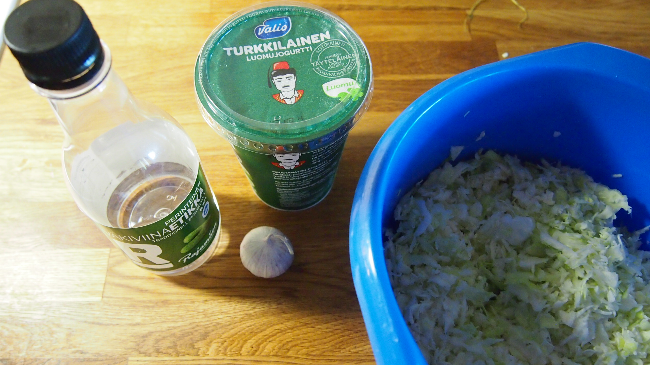 Raasta kaali ja lisää raaste sekä väkiviinaetikka, sokeri ja suola kannelliseen säilytysastiaan. Ravista voimakkaasti ja laita jääkaappin maustumaan vähintään puoleksi tunniksi. Raasta valkosipuli turkkilaisen jogurtin joukkoon ja laita se myös takaisin kylmään maustumaan. Sekoita kaali ja jogurtti keskenään vasta juuri ennen tarjoilua.
