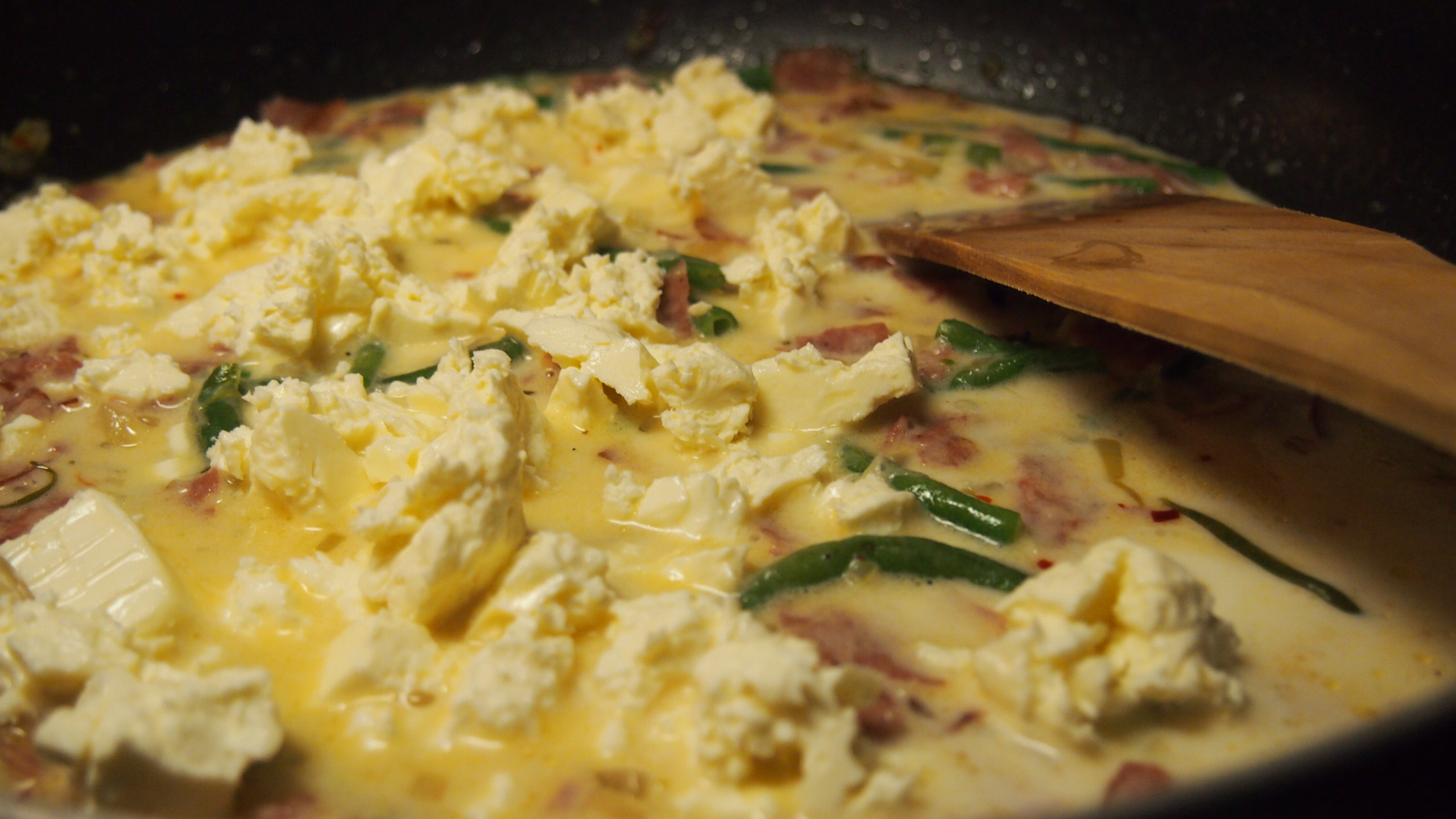 Keitä ensin papuja suolatussa vedessä 6 minuutin ajan. Silppua sipulit pieneksi. Kuullota ensin sipuli voissa, lisää hetken päästä joukkoon myös valkosipuli. Lisää perään vesi ja rosmariininoksa sekä chilihiutaleet, ripaus suolaa ja mustapippuria. Anna kiehua kymmenisen minuuttia. Laita pasta kiehumaan. Nappaa tässä välissä rosmariininoksa pois. Lisää kastikkeen joukkoon pieneksi silputtu meetvursti, pavut ja ruokakerma. Jos haluat oikein täyteläisen ja juustoisen kastikkeen lisää joukkoon myös fetajuusto. Meillä oli tässä versiossa fetaa, mutta oltiin molemmat sitä mieltä että fetan olisi voinut yhtä hyvin jättää poiskin. Ei pahaa mutta juusto teki pastasta aika paljon raskaamman.