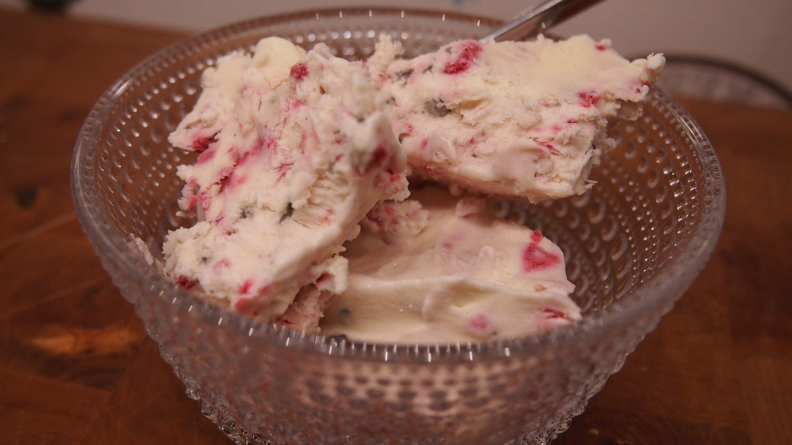 Jäätelö oli todella herkullista, mutta myös ehkä aavistuksen makean puoleista. Tuunasimme ohjetta hiukan ja laitoimme pohjaan 6 dl kermaa ja 1 purkin kondensoitua maitoa. Tämä oli meidän mielestä parempi makeuden suhteen. Jäätelöpohjaa on helppo maustaa haluamallaan herkuilla. Tällä kertaa jäätelöstä tehtiin kaksi eri versiota: vadelma-turkinpippuri sekä maitosuklaa-oreokeksi.