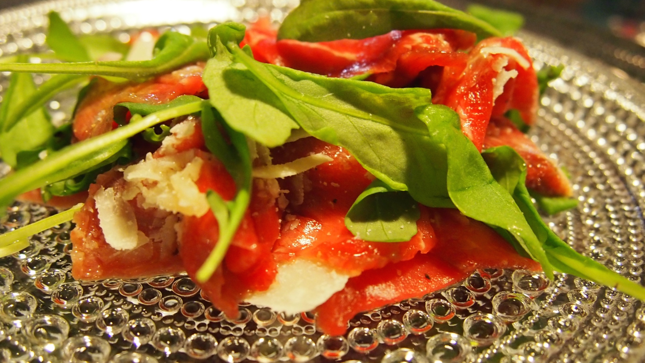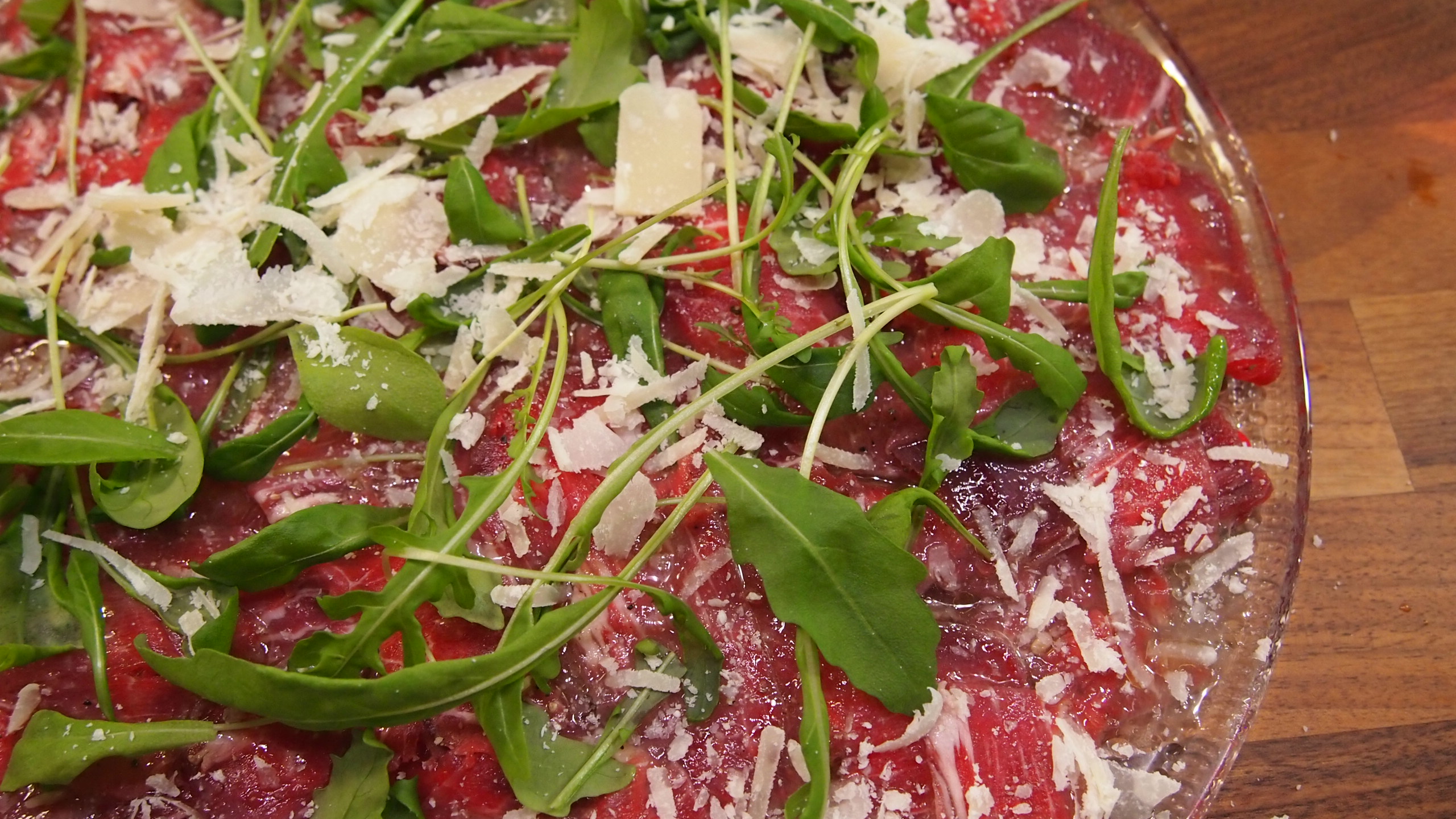 Nosta liha jääkaappiin noin tuntia ennen tarjoilua. Ota kelmu pois ja leikkaa liha terävällä veitsellä niin ohuiksi siivuiksi kun vaan pystyt. Asettele kohmeiset siivut tarjoiluastialle. Ripottele päälle vielä sormisuolaa ja mustapippuria. Laita lihan päälle rucolaa ja parmesanlastuja ja lisää vielä sitruunaöljy viimeistelemään annos. Tarjoile heti. Aivan tuli vesi kielelle tätä kirjoittaessa, koskahan voisi taas tehdä Carpacciota alkupalaksi?