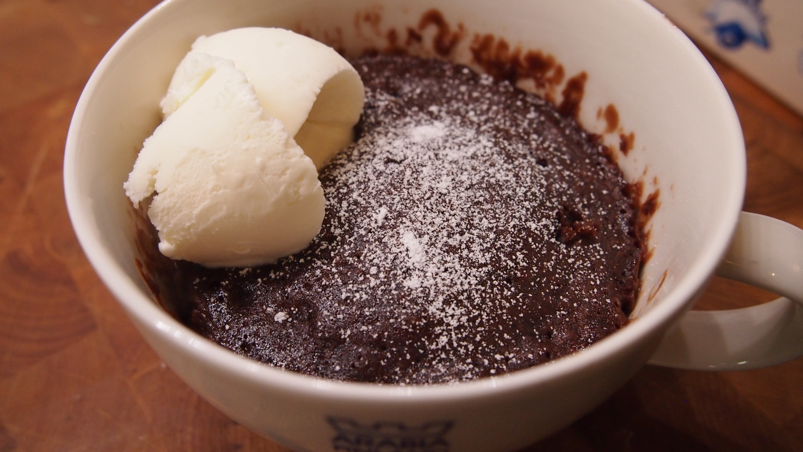 Yhdistä kuivat aineet keskenään. Sulata voi kattilassa. Lisää joukkoon siirappi ja perään kananmuna hyvin sekoittaen. Lisää jauhoseos muutamassa erässä ja lopuksi vielä kerma tai maito. Kaada taikina kahteen (tilavuus n. 3 dl) mukiin tai kolmeen pienempään mukiin. Huomioi, että taikina nousee mikrossa kiehuessaan ja laskeutuu sitten lopuksi takaisin. Jätä siis mukiin vähän tilaa. Kypsennä kakut mikrossa yksitellen, 630 W ja 2 min 30 sek. Tässä ajassa taikina kypsyy kauttaaltaan kypsäksi mutta jää vielä meheväksi. Jos haluat kakun keskustasta vähän raa’an, kypsennä 2 min. Siivilöi pinnalle tomusokeria ja tarjoile lämpimänä vaniljajäätelön kera. Kakku oli syöjän mukaan erittäin herkullista ja mehevää ♥