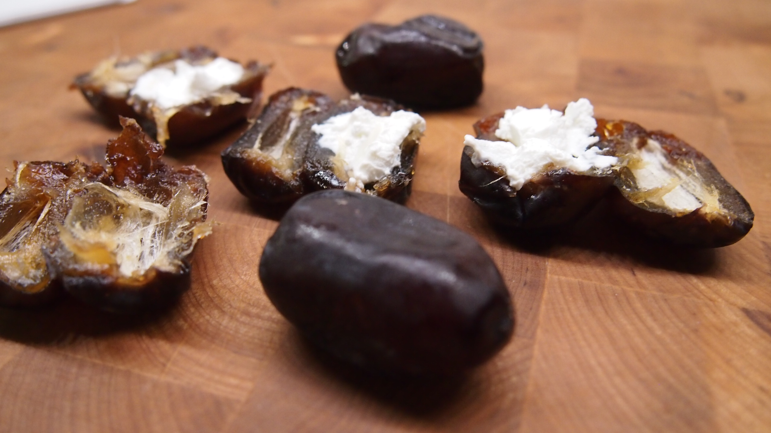 Halkaise taatelit ja poista kivi. Lisää taatelin kuoppaan vuohenjuustoa, laita ”kansi” kiinni ja kääri ympärille parmankinkkusiivu. Avot, valmista! Nämä voivat odottaa tovin jääkaapissakin ennen tarjoilua. Suolainen juusto ja kinkku sopivat loistavasti makean taatelin kanssa yhteen.