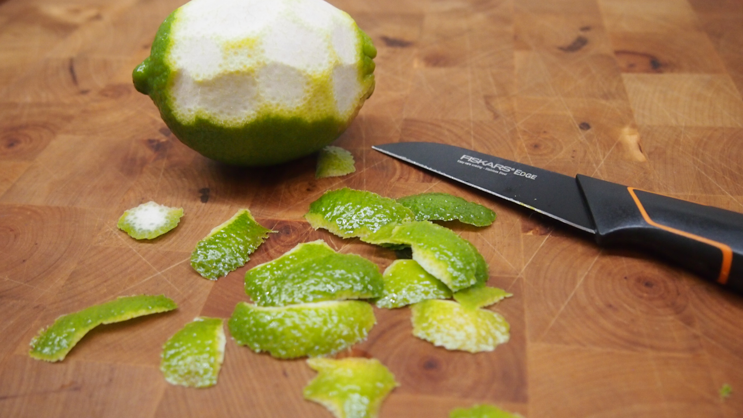 Tiputtele jäiset karpalot litran pulloon. Pese lime huolellisesti ja leikkaa kuoresta pitkiä suiroja. Lisää myös limen kuoret pulloon. Kaada kirkas viina päälle ja ravista varovasti ainekset sekaisin. Anna snapsin maustua pari viikkoa jääkaapissa, muista sekoitella sitä aika ajoin. Aaton aattona siivilöi snapsi marjoista ja limen kuoresta ja laita pakkaseen jäähtymään aattoiltaa varten. Kippis!