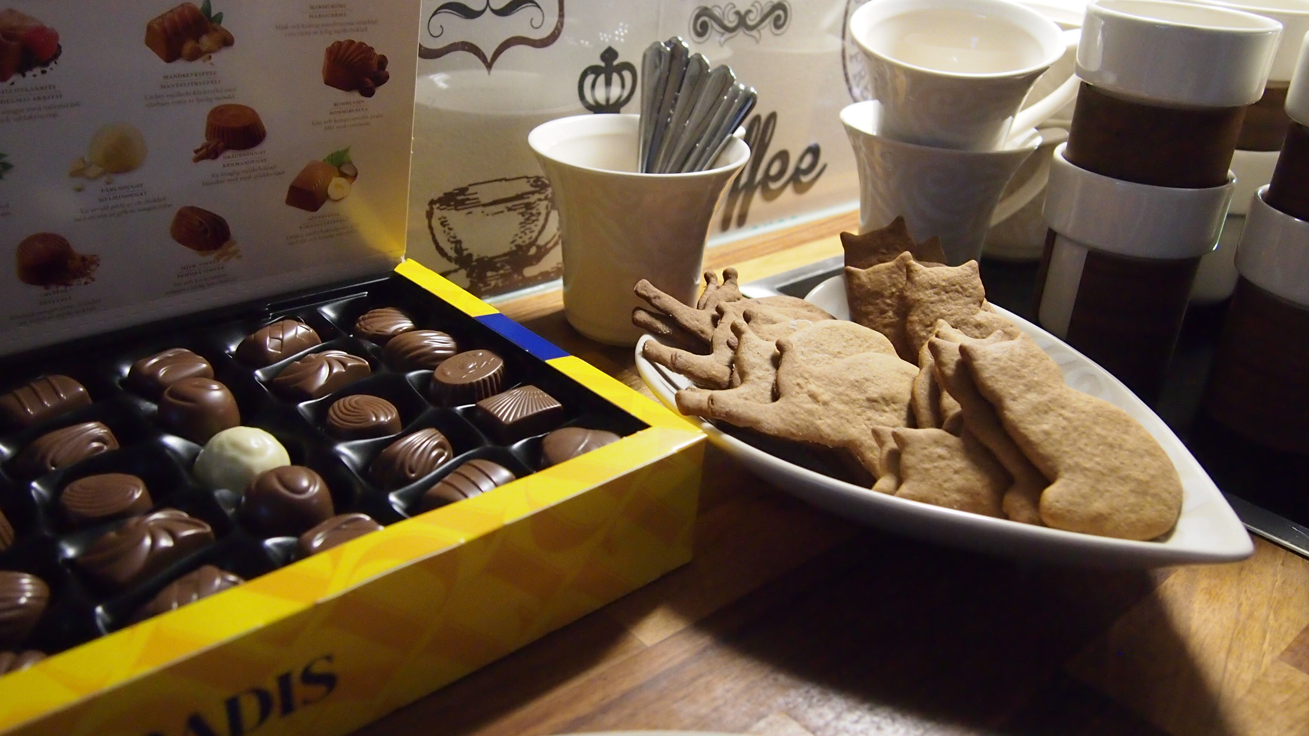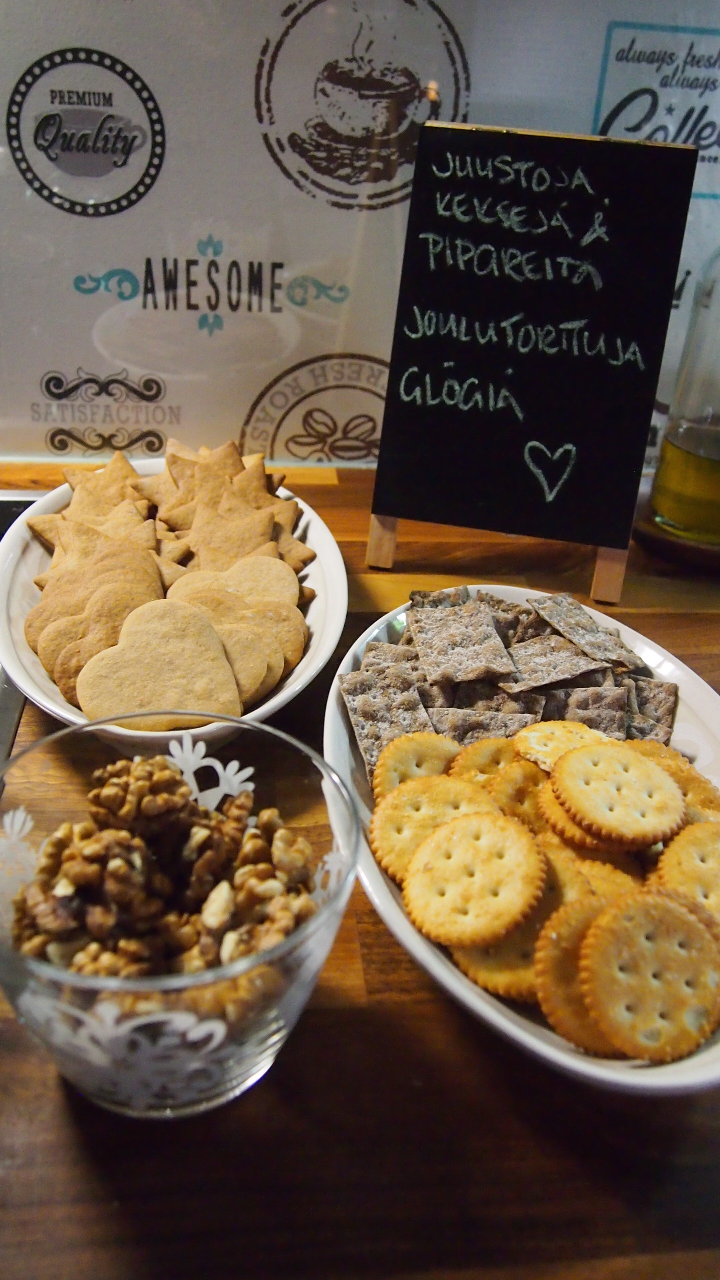 Glögin kanssa tarjoilimme Aurajuustoa, Brietä saksanpähkinöillä ja vaahterasiirapilla höystettynä sekä keksejä, pipareita ja viinirypäleitä. Ja löytyi pöydästä tietenkin möys Joulutorttuja sekä Micken ehdoton suosikkikonvehtirasia, Maraboun Paradis.