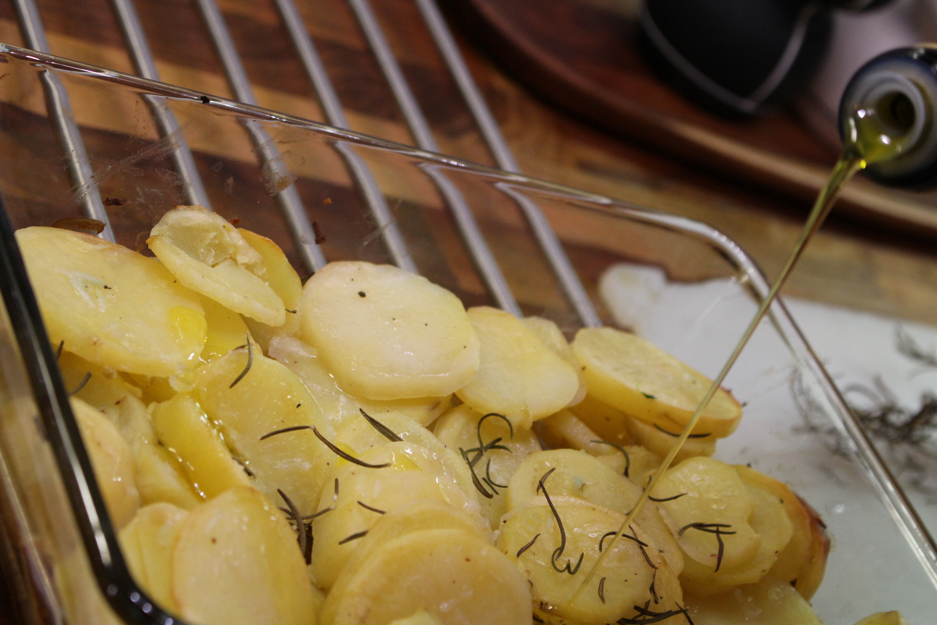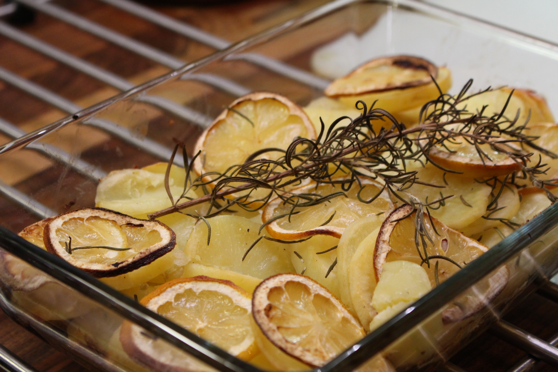 Kuori perunat ja viipaloi ne. Kuivaa ylimääräinen tärkkelys pois perunaviipaleiden pinnalta puhtaalla keittiöpyyhkeellä. Laita perunat uunivuokaan ja lisää joukkoon pieneksi pilkottu valkosipuli. Mausta perunat suolalla ja pippurilla. Voit lorauttaa oliiviöljyn mukaan joko nyt tai vasta kypsentämisen jälkeen mehevöittämään perunoita. Me lisäsimme tällä kertaa öljyn kypsien perunoiden päälle. Asettele sitruunanviipaleet perunoiden päälle ja lisää vielä rosmariinin oksat. Paista uunin keskitasolla 200 asteessa noin tunti kunnes perunat ovat kypsiä. Perunat sopivat loistavasti juurikin karitsan kareelle, mutta maistuvat ne erinomaiselle myösmgrillatun kanan tai lohen kanssa.