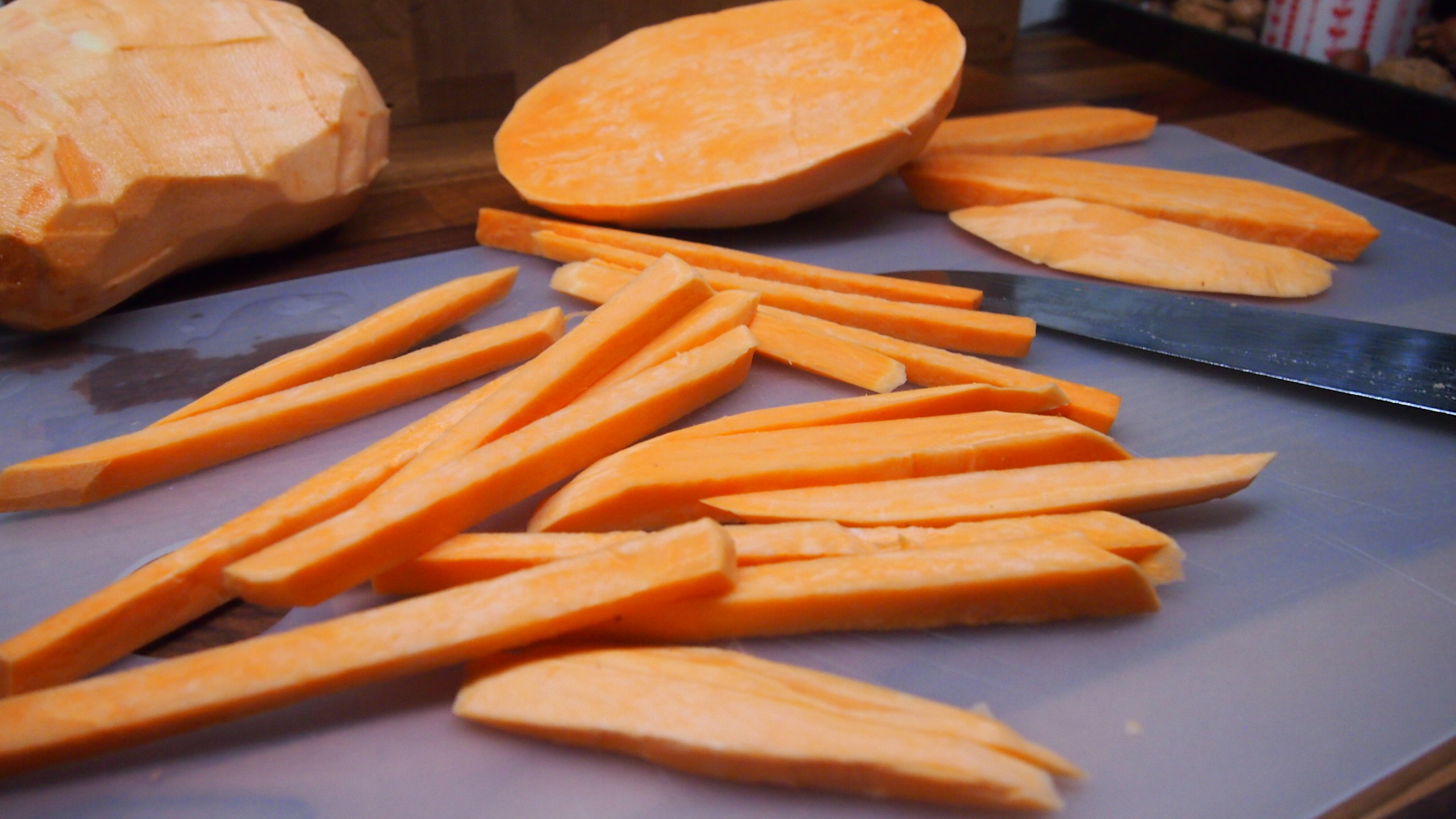 Bataattiranskalaiset ovat kiva vaihtoehto perunalle ja ne maistuvat taatusti koko perheelle. Bataatin oma makeus ja suolainen yrttimausteseos muodostavat herkullisen combon. Ainoa mitä kotitekoisista bataattiranskalaisista puuttuu on rapeus, mutta hyvä maku korvaa koostumuksen. Jos jolla kulla on pettämätön vinkki rapeuteen, niin se otetaan mielellään vastaan 🙂 Tämä ohje on muunnelma Katukeittiö -kirjan reseptiin perustuen.