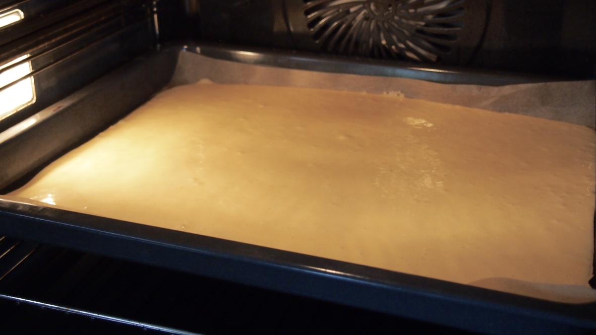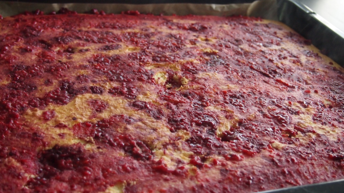 Sulata voi ja anna sen jäähtyä. Vatkaa huoneenlämpöiset munat ja sokeri vaaleaksi vaahdoksi. Yhdistä kuivat aineet keskenään ja siivilöi ne muna-sokerivaahtoon tasaisesti hiljalleen vatkaten. Lisää joukkoon lopuksi voisula ja maito ja sekoita huolellisesti. Levitä takina leivinpaperilla vuoratulle uunipellille tasaiseksi levyksi. Murenna pakastevadelmat jäisinä pieneksi muruksi ja ripottele muru taikinan päälle ennen paistamista. Itseltähän tämä vaihe unohtui (oli monta rautaa tulessa samaan aikaan), mutta koska halusin ehdottomasti vadelmat mukaan lisäsin ne lähes paistuneen piirakan päälle. Joten siksi kuva piirakasta on aika vadelmainen, oiken valmistettuna ne uppoaa paremmin pohjaan. Paista piirakkaa 200 -asteisessa uunissa 15–20 minuuttia. Anna jäähtyä.