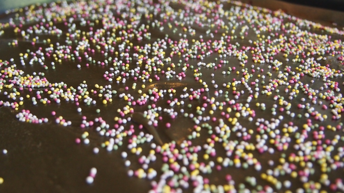Sulata kuorrutuksen voi kattilassa ja sekoita sen joukkoon tomusokeri ja salmiakkiliuos. Värjää kuorrutus halutessasi mustemmaksi mustalla pastavärillä. Levitä kuorrutus jäähtyneen kakkulevyn päälle. Koristele vaaleanpunaisilla nonparelleilla. Tässä kannattaa olla nopea, sillä kuorrute kovettui todella nopeasti ja osa nonparelleista ei enä tarttunut kuorrutteeseen. Leikkaa salmiakkiruudun mallisiksi paloiksi, kun kuorrutus on kovettunut ja nauti!