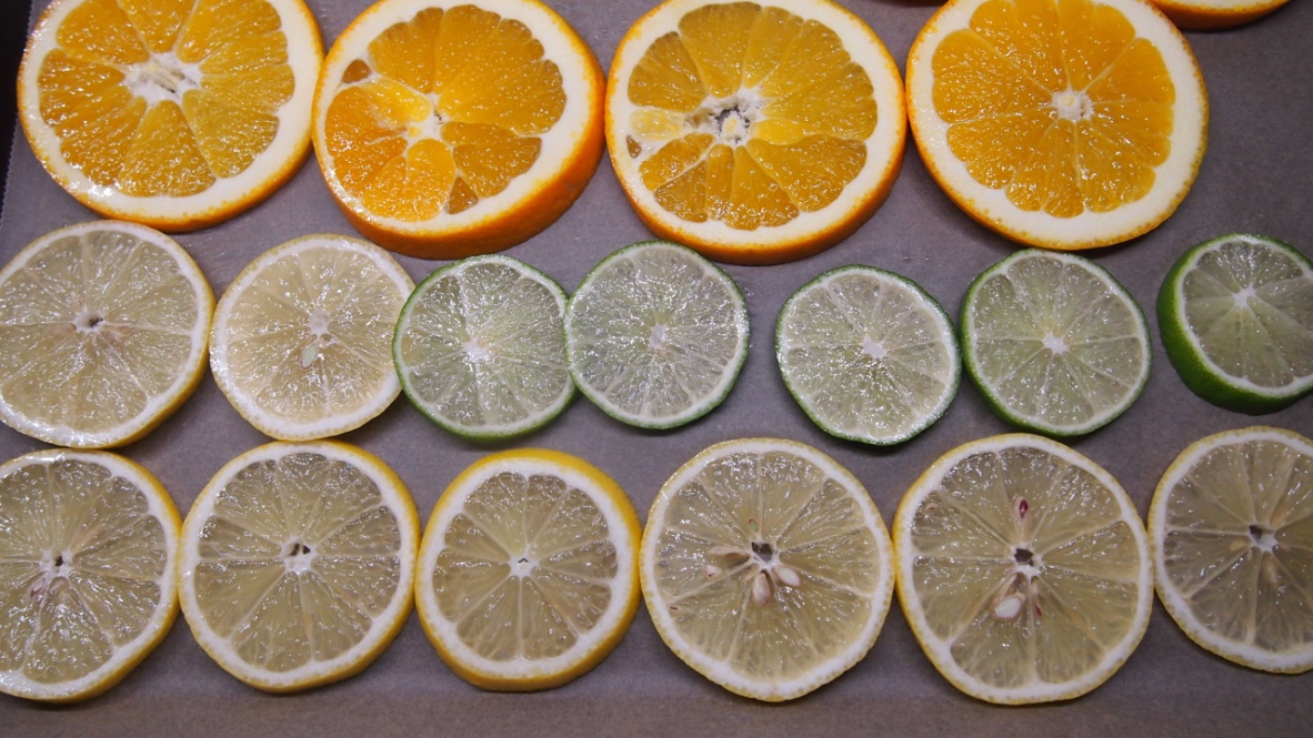 Valitse kaupasta kauniita ja kiinteitä hedelmiä. Kun hankit jokaista sitrushedelmää 1-2, niistä tulee jo aika monta rengasta. Näissä kuvissa on aina 1 kpl kutakin hedelmää. Leikkaa hedelmät ohuiksi viipaleiksi ja levitä ne leivinpaperin päälle pöydälle, tasolle tai pellille. Anna viipaleiden kuvia 2-4 päivää kuivassa paikassa. Käännä viipaleet päivittäin, jotta ne kuivuvat tasaisesti. Itse kuivatin näitä pellillä kodinhoitohuoneen lattialla lattialämmityksen avustuksella. Ensimmäiset viipaleet ovat jo päässeet Joululahjapaketteja koristamaan.