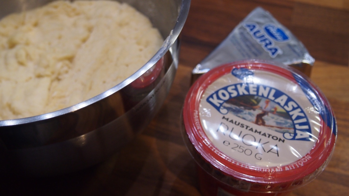 Koskelaskijakastike on osunut muutaman kerran kaupan hyllyillä silmiin ja eräänä iltana kun mietimme mitä herkkua viikonloppuna tehdään, päätimme kokeilla sitä pizzan kastikkeena. Koskenlaskijapurkin löytää juustohyllyltä ja purkissa itsessäänkin on mm. pizzaohje. Me teimme oman maun mukaan ja tällainen siitä tuli. Luottopohjan ohje on Valion sivuilta, korvasimme ainoastaan tavalliset vehnäjauhot Durum -vehnäjauhoilla.