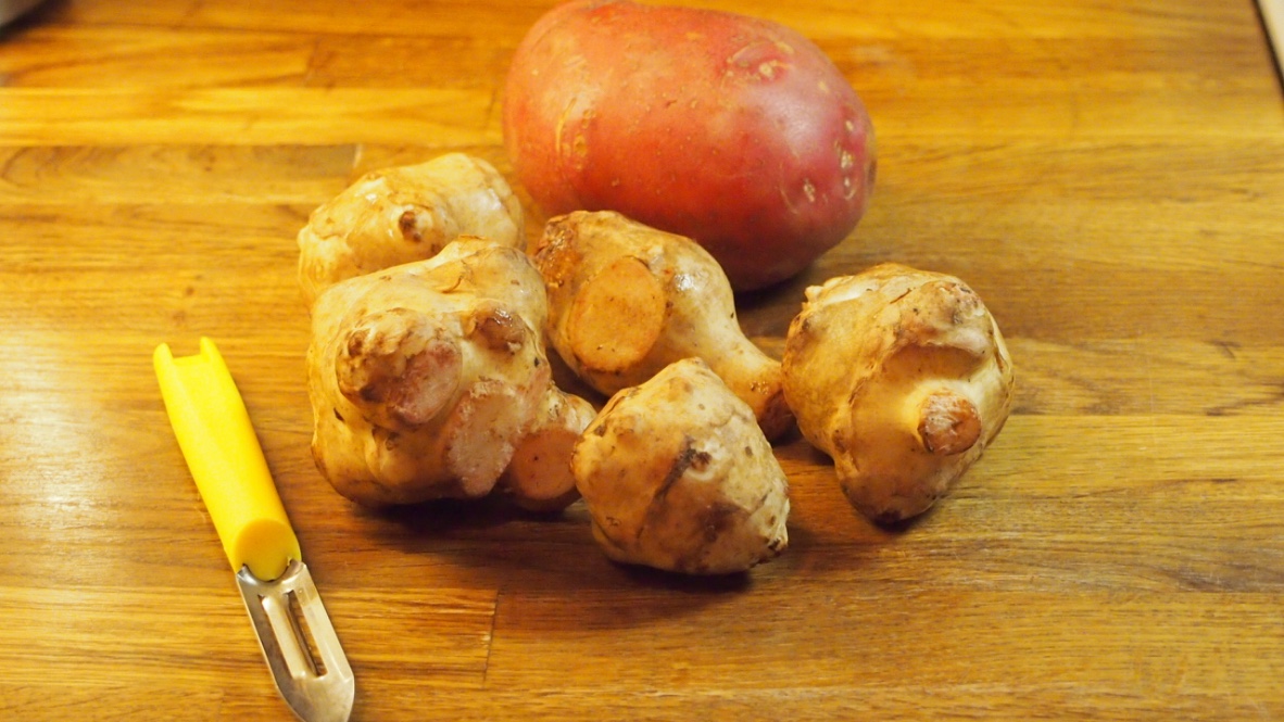 Kuori maa-artisokat ja perunat ja leikkaa ne lohkoiksi. Laita lohkot kattilaan ja laske vettä päälle sen verran että perunat ja maa-artisokat peittyvät. Lisää joukkoon kasvisliemikuutiot sekä kuoritut valkosipulinkynnet. Keitä kypsäksi, noin 15-20 min. Soseuta ainekset sauvasekottimella tasaiseksi. Lisää joukoon suola ja valkopippuri sekä kerma ja sekoita. Tarkista maku ja tarjoile lämpimänä sellaisenaan tai tuoreen leivän kera. Keiton päälle voi asetella muutaman krutongin tai rapeaksi paistettuja pekonikuutioita.