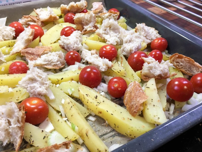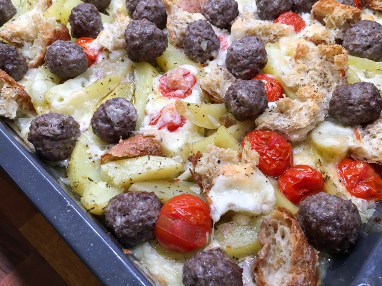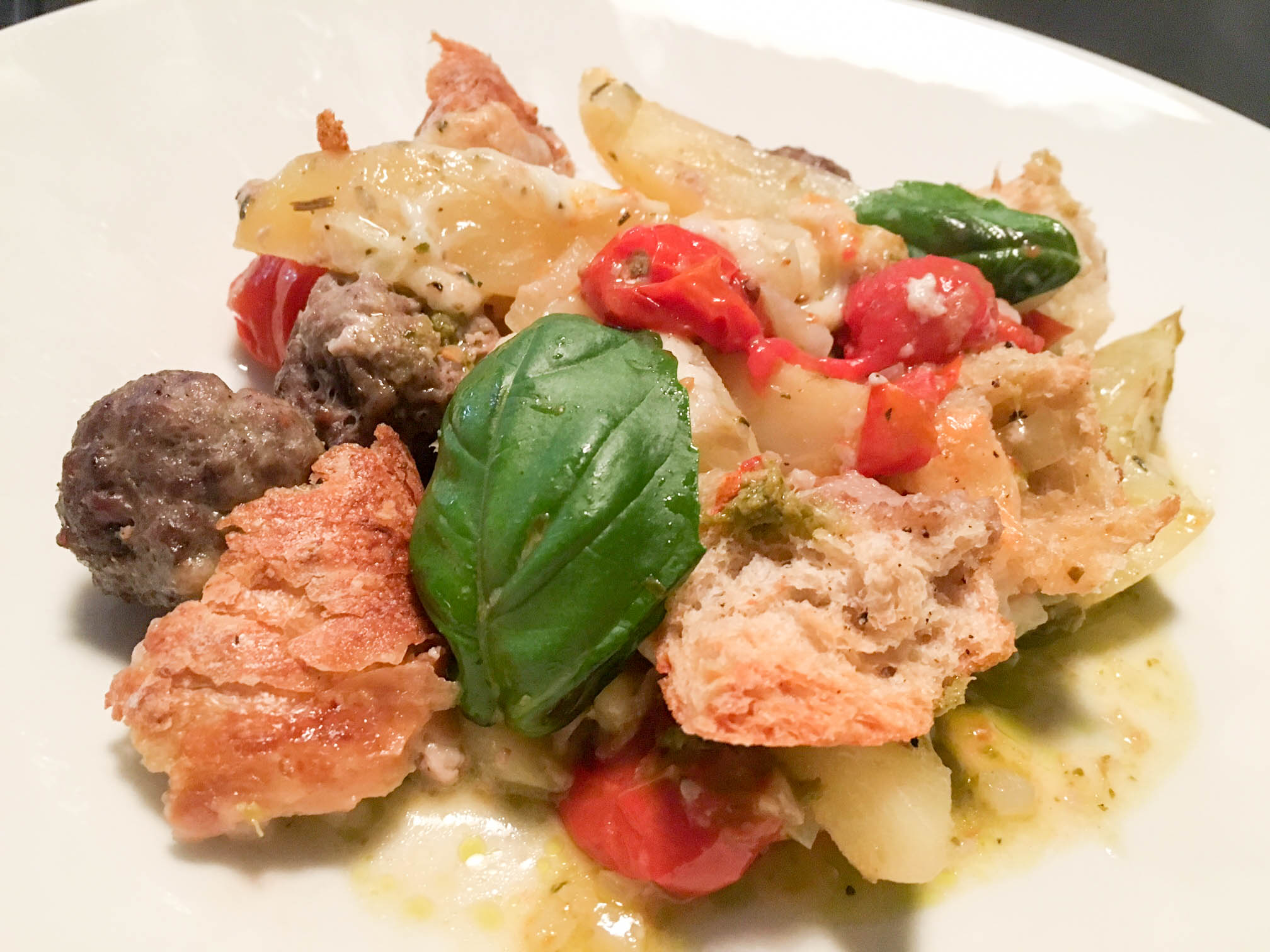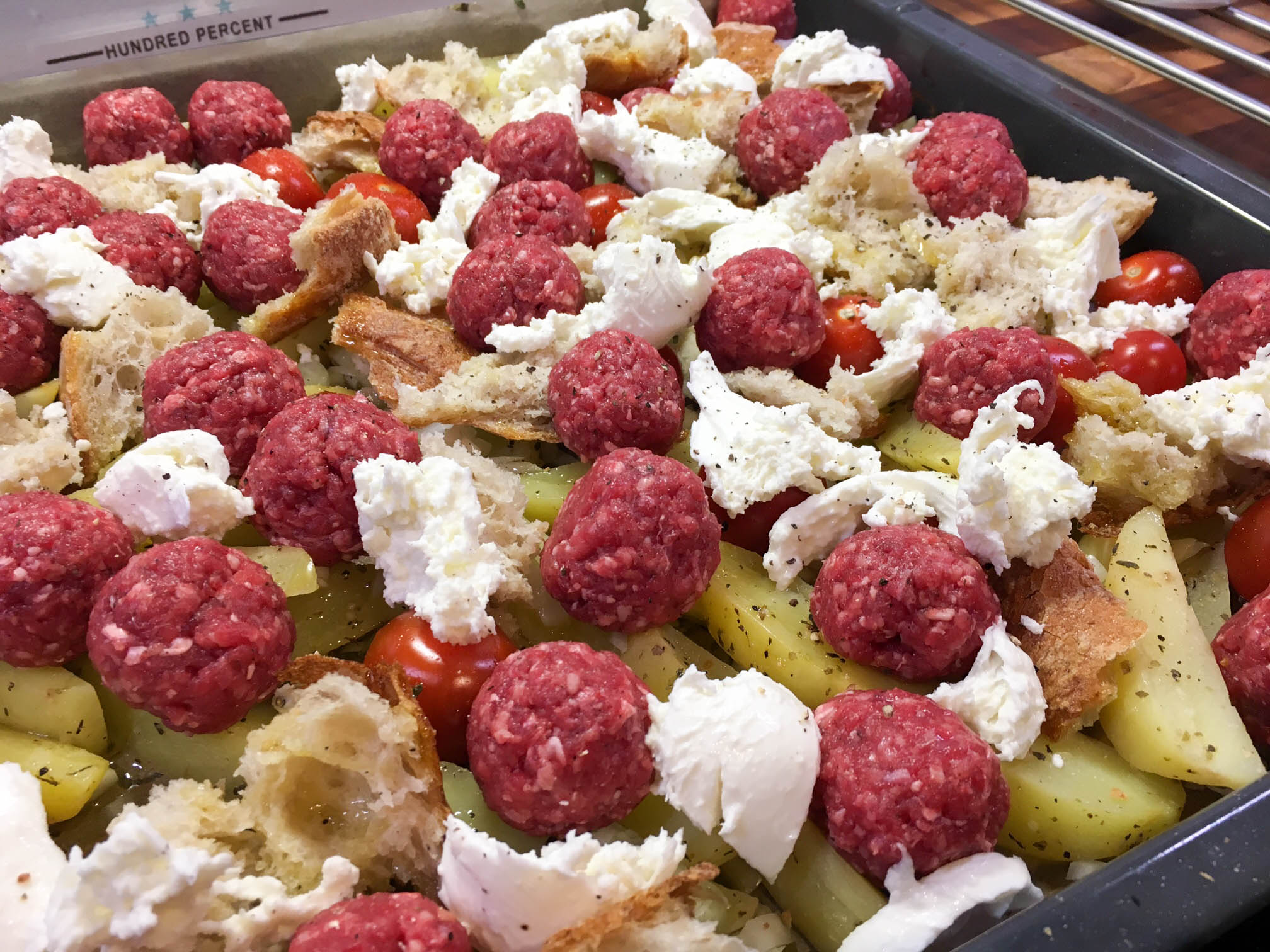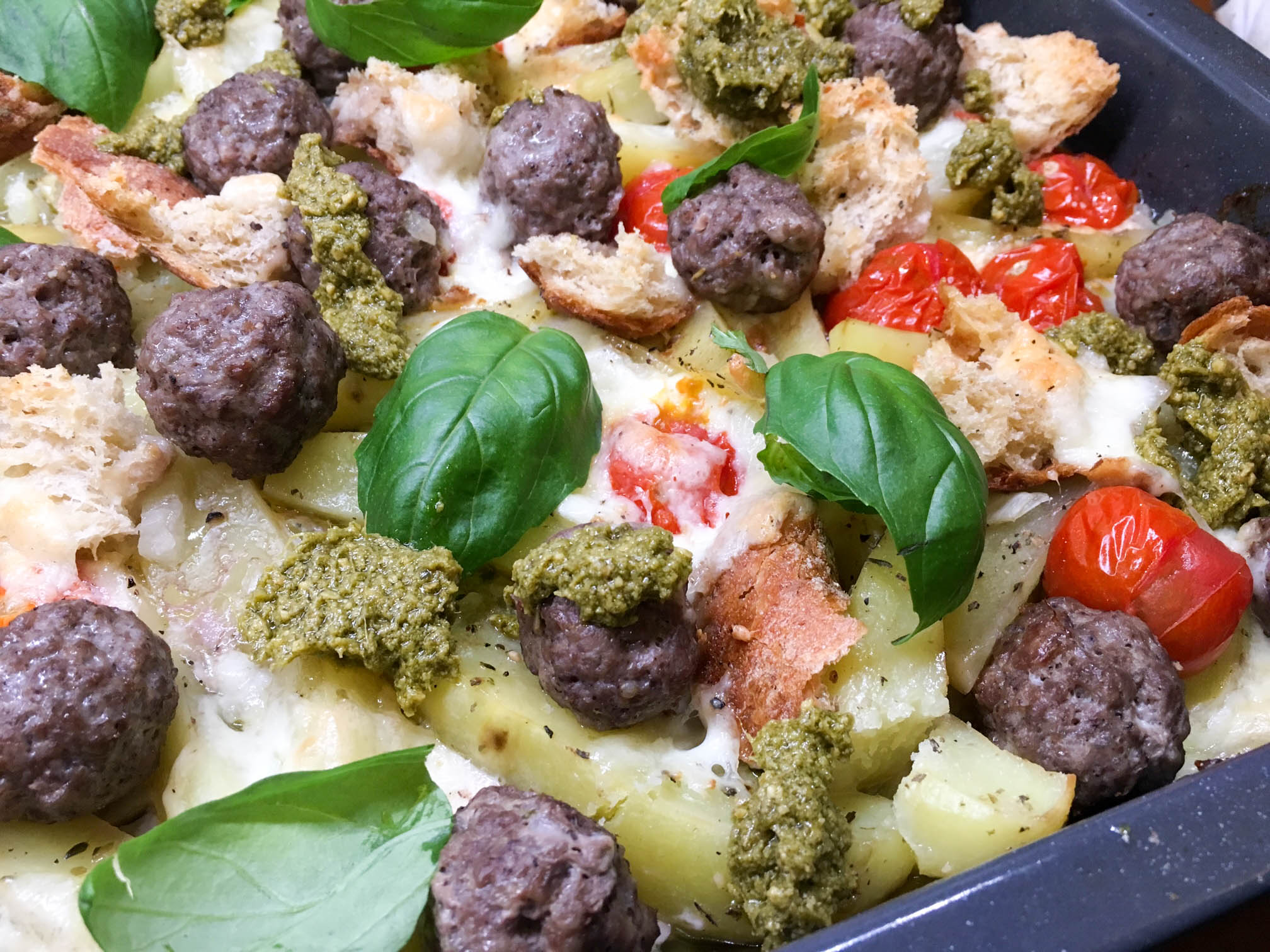Valmista perunoiden kypsyessä lihapullat. Sekoita jauhelihan joukkoon kananmuna ja mausta jauheliha suolalla ja maustepippurilla. Muotoile lihapullat ja jätä ne odottamaan. Kuori ja leikkaa sipuli kuutioiksi tai ohuiksi renkaiksi. Leikkaa myös valkosipuli ohuiksi siivuiksi. Revi leipä kuutioiksi. Kun perunat on esikypsytetty lisää pellille leipäpalat ja kirsikkatomaatit sekä sipulit. Valuta oliiviöljy ainesten päälle ja mausta suolalla ja pippurilla. Nostele lihapullat ainesten päälle ja revi joukkoon vielä mozzarella. Paista 200 asteessa noin 25 min tai niin kauan kunnes lihapullat ovat kypsiä ja muut ainekset pehmeitä ja paahtuneita. Koristele valmis ruoka basilikalla ja pestolla.