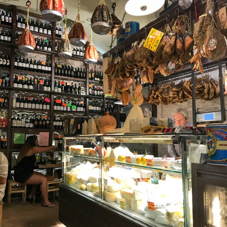 Illallinen herkkukaupassa, jossa myytiin lihaa, juustoja, viiniä ja pastaa oli elämys ja ihan erilainen kokemus kuin mikään muu Rooman ruokailu. Pienissä pöydissä nautittiin paperilautasilta italialaisia herkkuja, kuten tomaatti-mozzarellasalaattia, erilaisia bruchettoja sekä tietenkin italialaisia lihaleikkeleitä ja juustoja. Syödessä sai katsoa kun henkilökunta hääräsi upean tiskin takana annoksia asiakkaille. Hyvä palvelu ja henkilökunta innostui kertomaan enemmänkin konseptista ja tuotteistaan. Tämä paikka toimisi meidän mielestä kuintenkin paremmin lounaalle kuin illalliselle. Mutta kokemus vailla vertaa!
