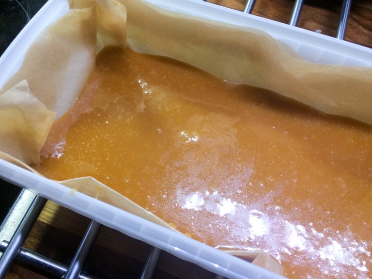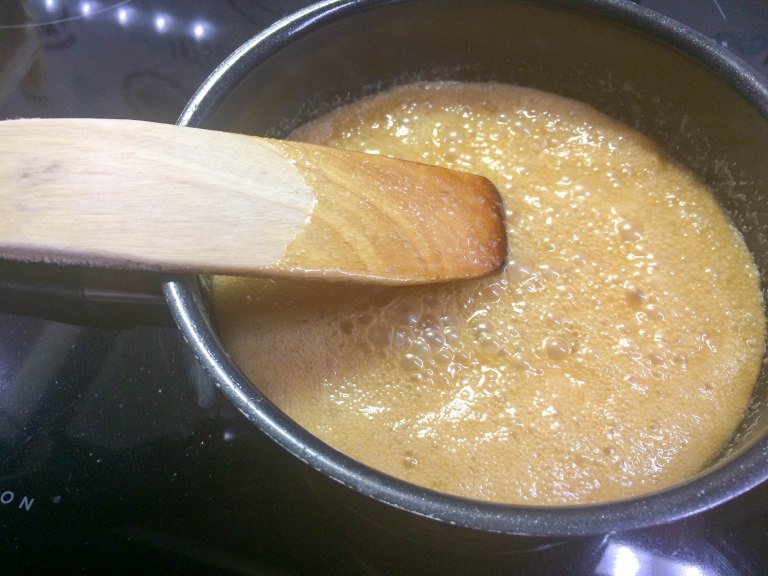 Vuoraa vuoka (noin 15×15) leivinpaperilla. Me käytimme tähän pitkulaista säilytysrasiaa. Sekoita teflonkattilassa kaikki muut aineet paitsi suola. Kuumenna kiehuvaksi ja anna seoksen kiehua reilusti kuplien noin 20 minuuttia. Sekoittele toffeeta keittämisen aikana, jotta se ei pala pohjaan. Testaa toffeen rakenne tiputtamalla seosta hiukan kylmään veteen. Anna jäähtyä hetki. Jos tippa jähmettyy niin että siitä voi muotoilla pallon, toffee on valmista. Jos ei, jatka vielä keittämistä ja testaa hetken kuluttua uudestaan.