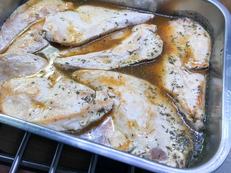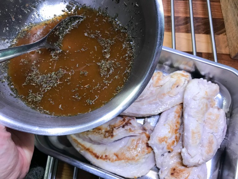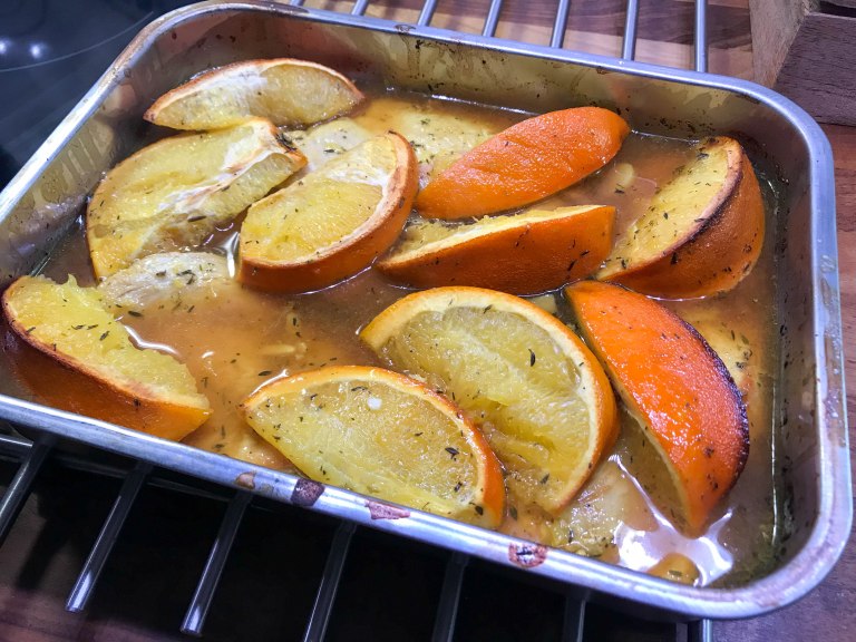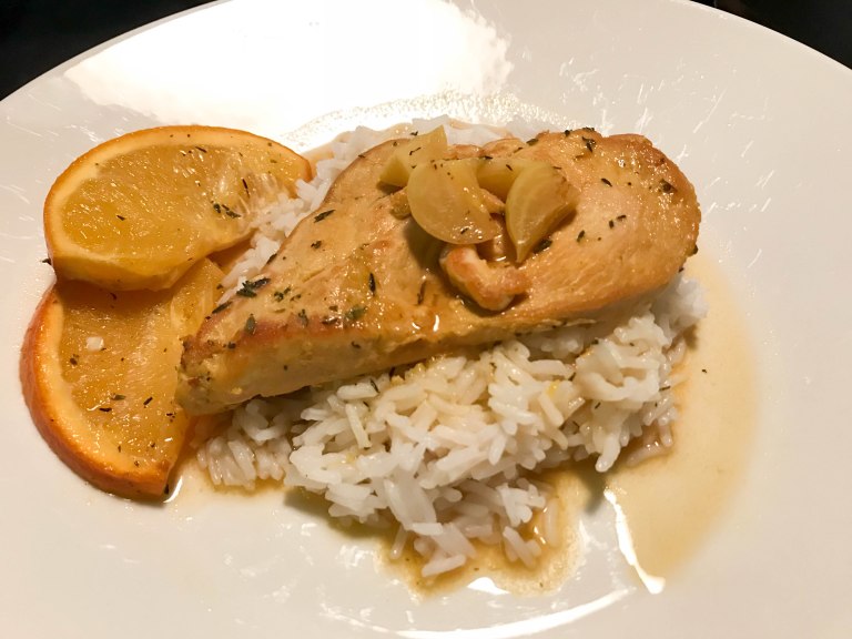 Lorauta oliiviöljyä pannulle ja paista kanojen pintaan kuumalla pannulla kaunis väri molemmin puolin. Mausta kanat kauttaaltaan suolalla ja laita uunivuokaan. Sekoita marinadin aineet ja kaada liemi fileille. Kääntele fileitä liemessä, jotta kanat maustuvat tasaisesti joka puolelta. Pese appelsiini ja leikkaa se lohkoiksi ja laita lohkot vuokaan. Lisää myös kuoritut ja puolitetut valkosipulin kynnet. Nosta vuoka uuniin ja kypsennä 200 asteessa n. 30 minuuttia. Tarjoile riisin ja vaikkapa uunikasvisten tai paistetun broccolinin kera. Mausteinen, kypsynyt appelsiini maistui todella hyvältä riisin ja kanan kanssa.