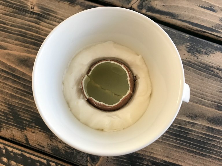 Keitä ensin kahvi. Vatkaa sitten kerma vaahdoksi ja lusikoi se kahvikuppiin niin että muki tulee lähes täyteen. Leikkaa Kindermunasta varovasti hattu irti ja poista yllätys munan sisältä. Upota Kindermuna lähes kokonaan kahvikupissa olevaan kermavaahtoon. Koristele annos tässä vaiheessa kaakaojauheella. Kaada kuuma kahvi Kindermunaan ja tarjoa heti, muna meinaan sulaa aika nopeasti kuuman kahvin ansioista kermavaahdon joukkoon. Meillä munan sulamisen jälkeen kuppiin lorahti vielä hiukan lisää kahvia. Nam!