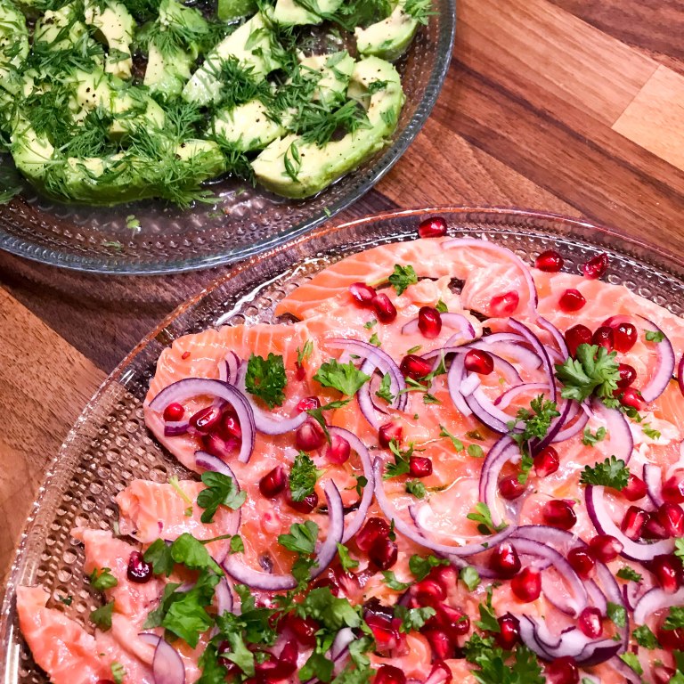 Lohi-granaattiomenacarpaccio ja graaviavocadot