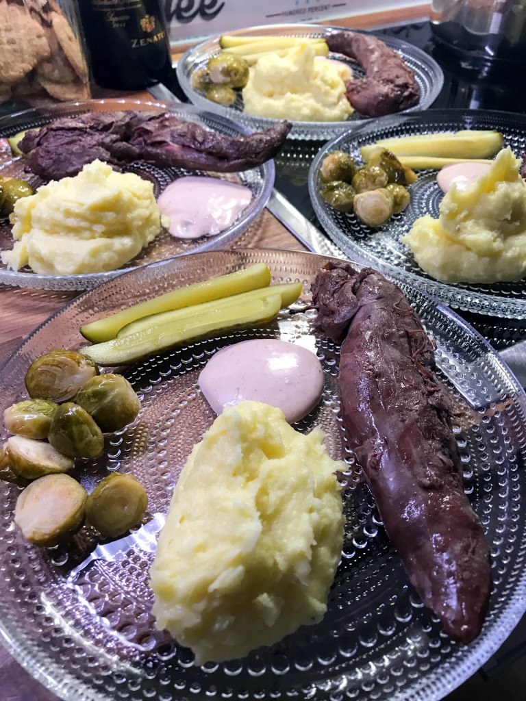 Grillattua poroa, puolukka-piparjuurimajoneesia, pottuvoita ja paahdettua ruusukaalia