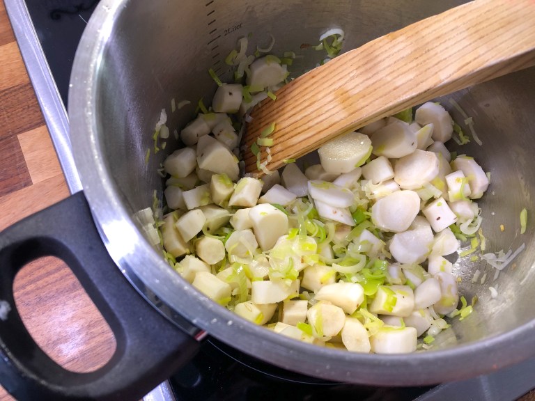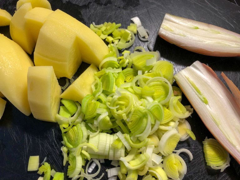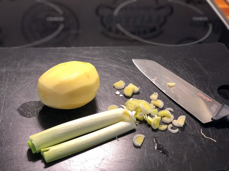 Käytä purjosipulista valkoinen ja vaaleanvihreä osa. Leikkaa purjo pituussuunnassa puoliksi ja leikkaa puolikkaat ohuiksi viipaleiksi. Kuori ja paloittele peruna isoiksi kuutioiksi. Kuori ja hienonna myös shalottisipuli.