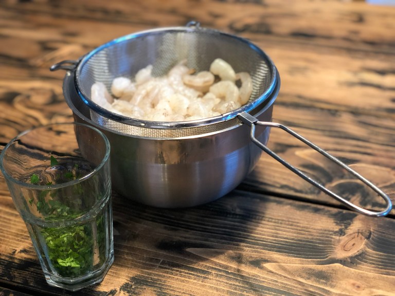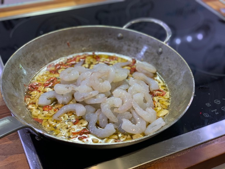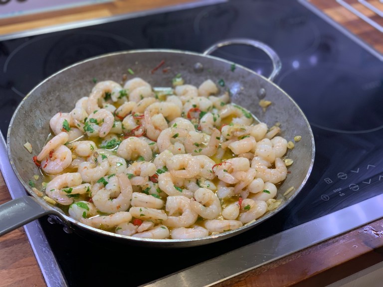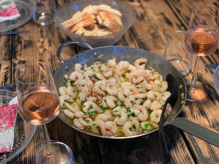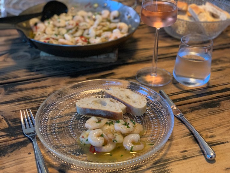 • Resepti on Espanjassa yleinen ”gambas al ajillo”, katkarapuja valkosipuliöljyssä.