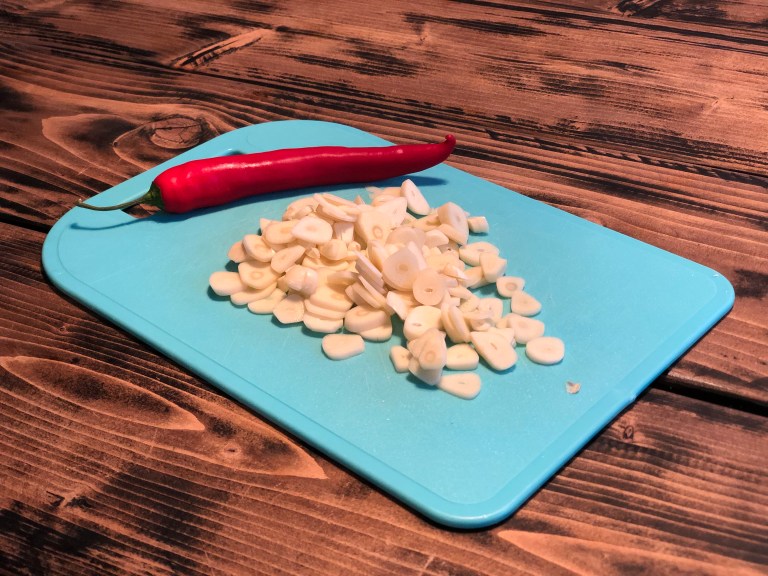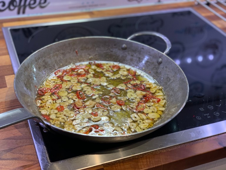 Anna scampien sulaa lävikössä jääkaapissa yön yli. Kuori ja pilko valkosipulit ohuiksi viipaleiksi. Viipaloi myös chili ohuiksi renkaiksi. Lisää valurautapannulle oliiviöljy, suola ja mustapippuri sekä valkosipulit ja chilit. Kuumenna keski / miedolla lämmöllä kunnes valkosipulit alkavat pikkusen rusehtamaan ja ovat pehmeitä. Lisää joukkoon scampit ja kypsennä käännellen kunnes ne ovat muuttuneet vaaleanpunaisiksi.