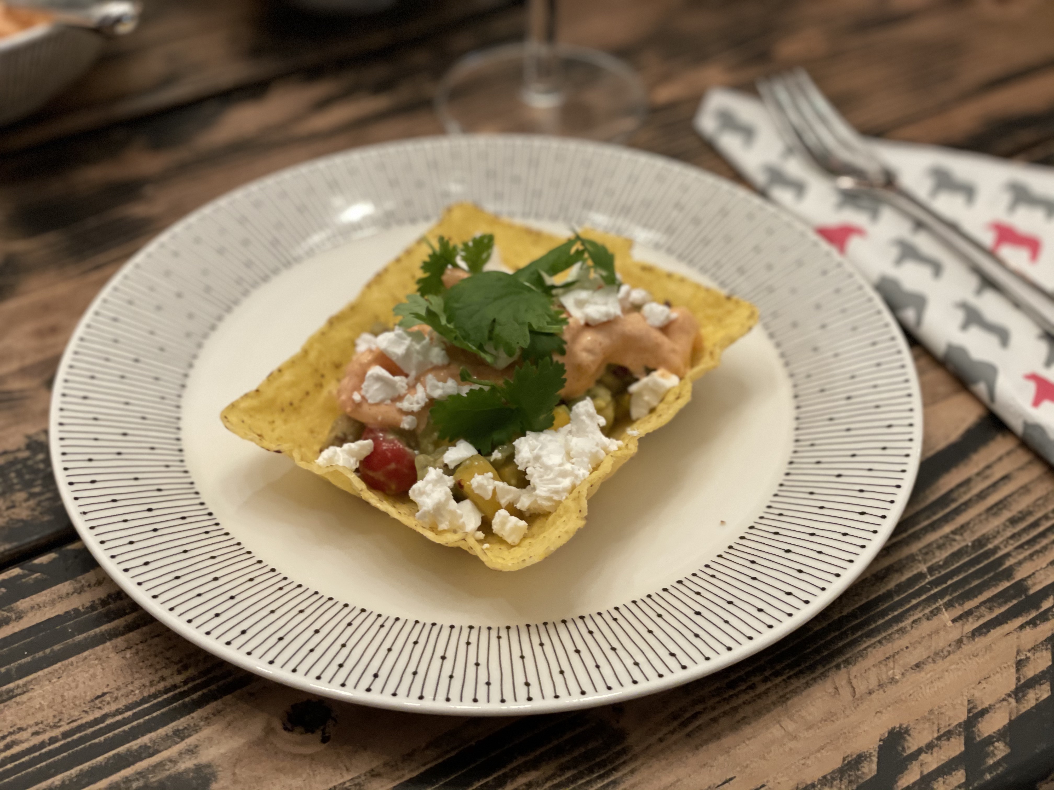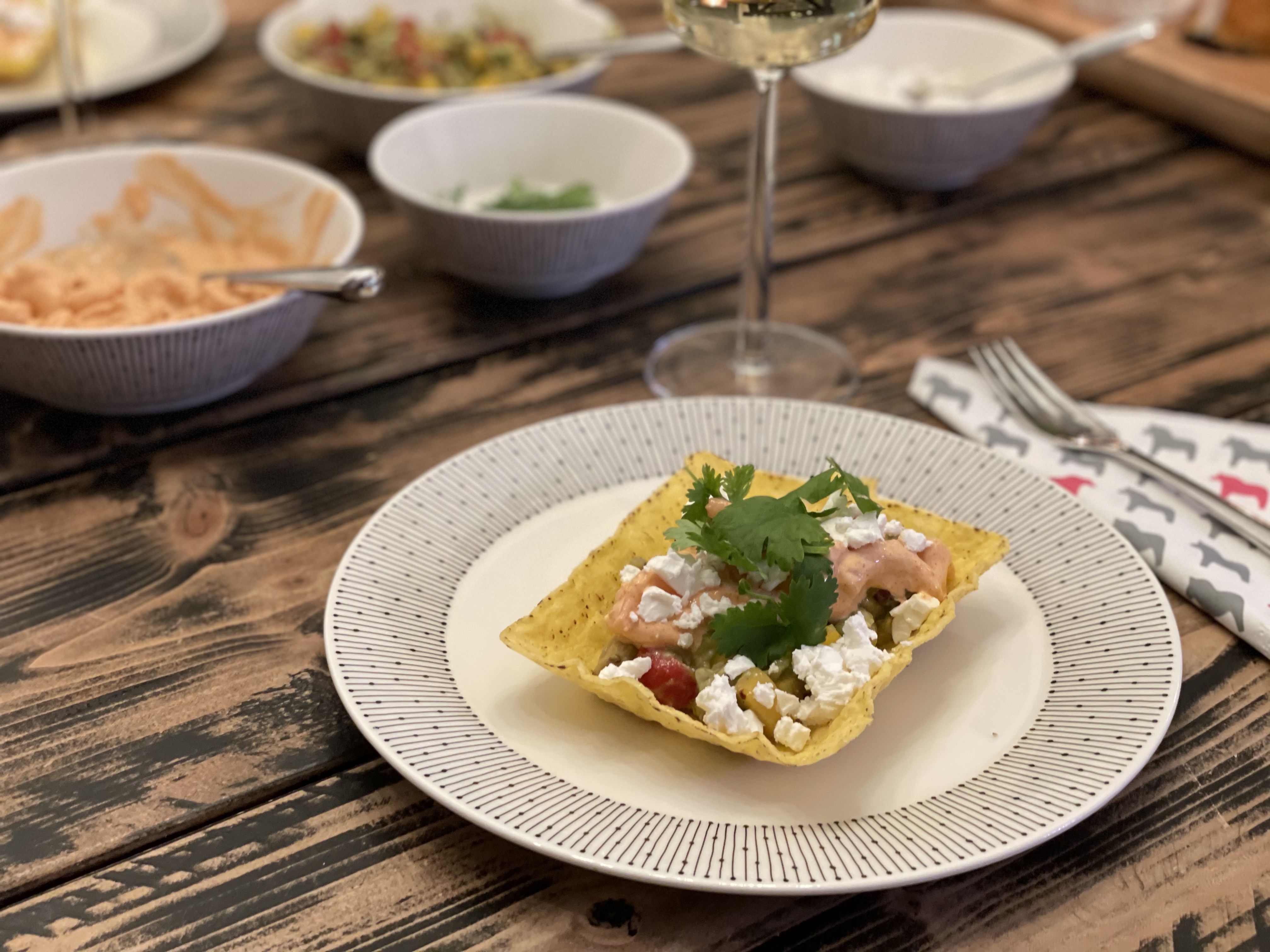 Valmista lohitäyte. Pehmennä tuorejuusto ja lisää joukkoon ranskankerma. Leikkaa kylmäsavulohi pieniksi kuutioiksi ja lisää seokseen. Kuori ja hienonna punasipuli täytteen joukkoon. Mausta suolalla, mustapippurilla ja sitruunamehulla.