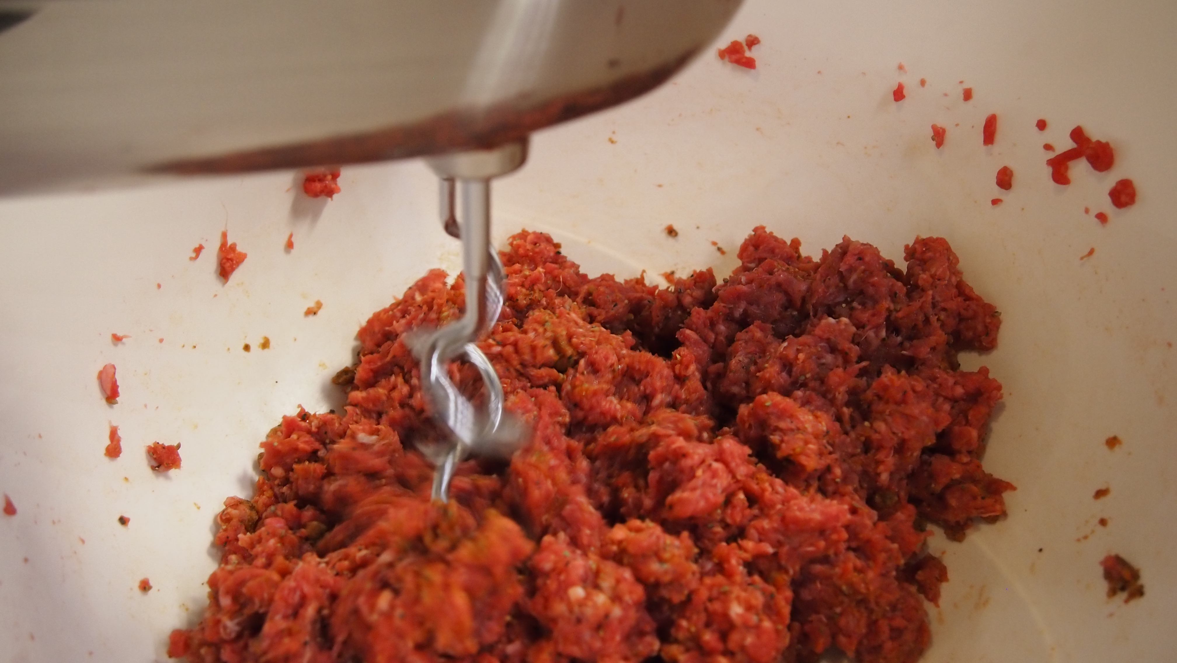 800 g naudanjauhelihaa tai 400 g nautaa ja 400 g lammasta (tämä mixi oli meidän taikinassa)